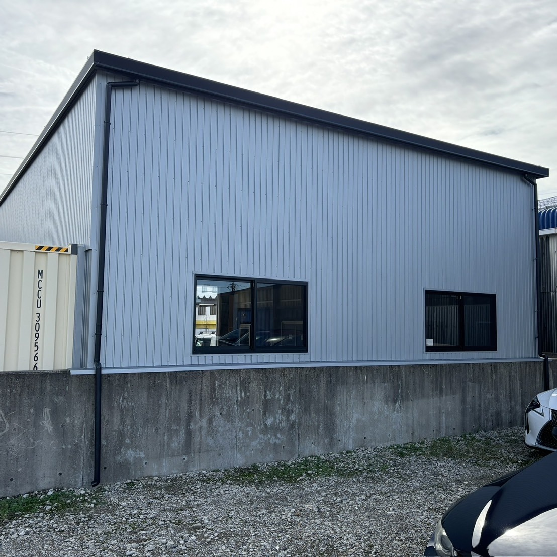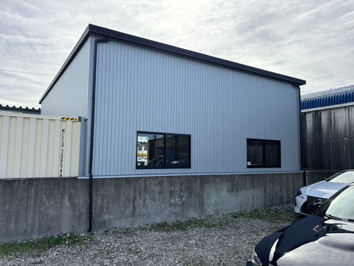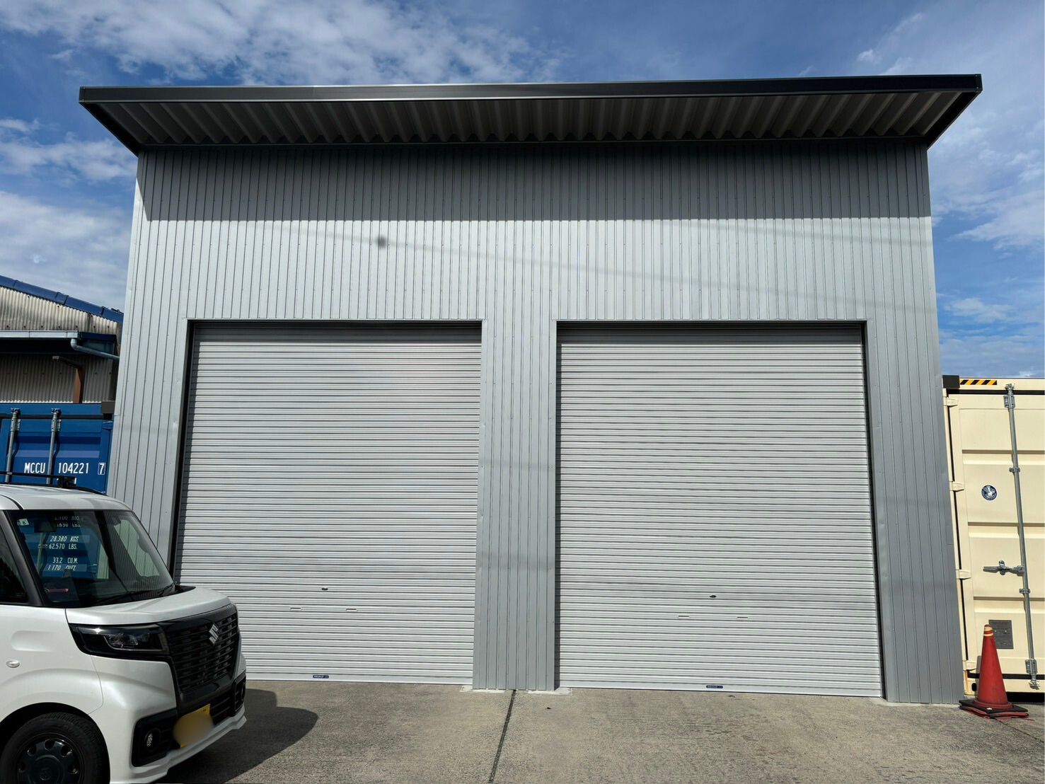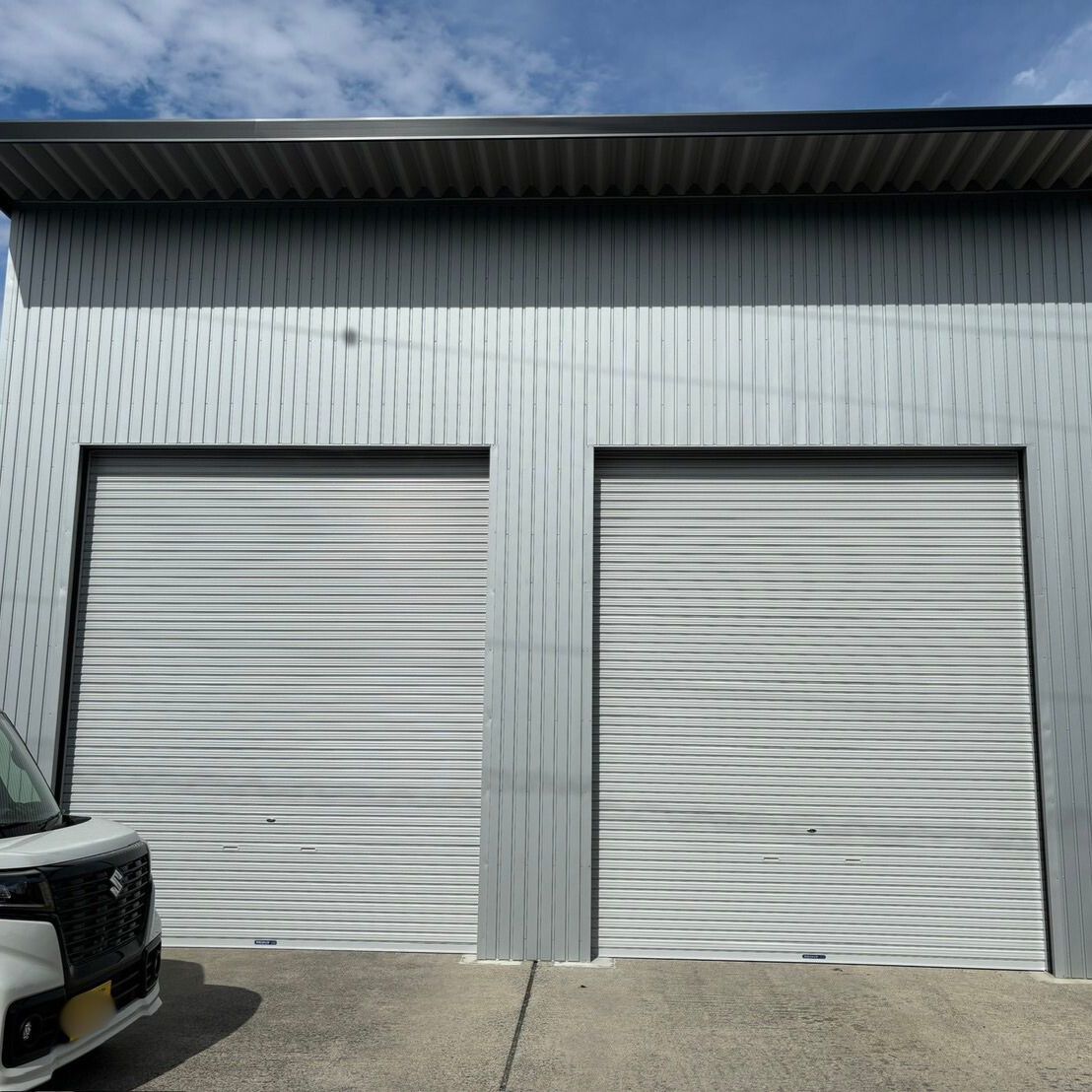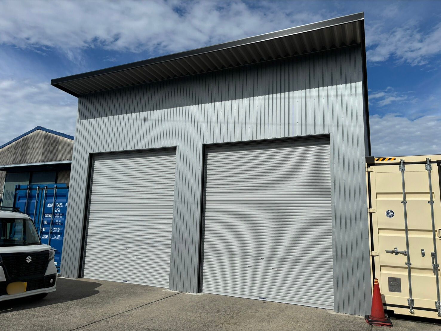 間口9m×奥行13m、高さ5m超という圧巻のスケール。重厚感のあるダブルシャッターと、外壁全面にガルバリウム鋼板板金を施し、スタイリッシュかつ高耐久なデザインに仕上がっています。