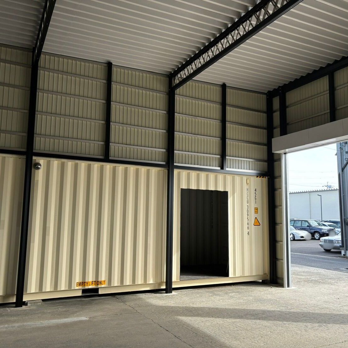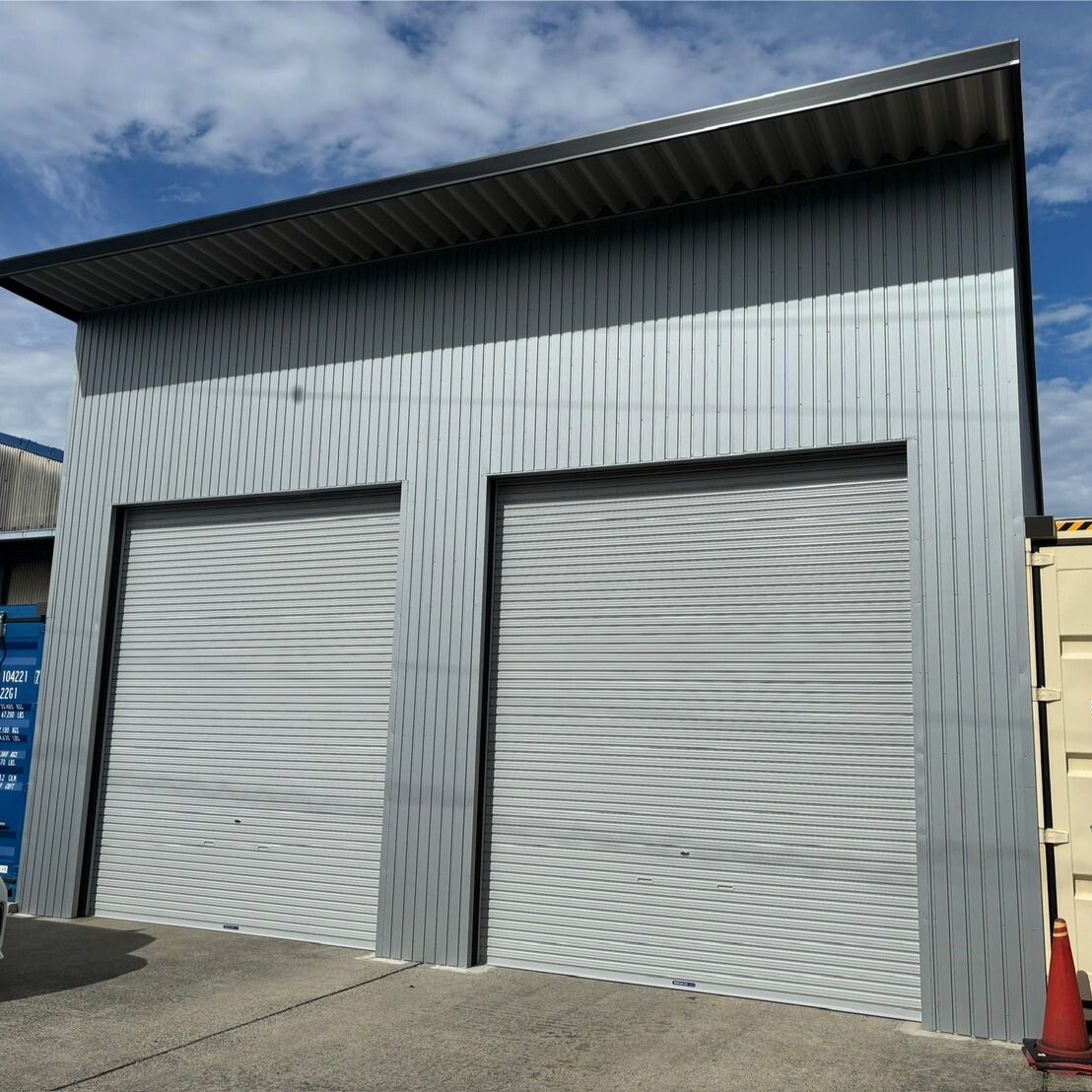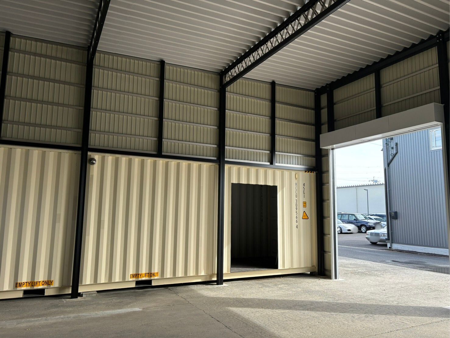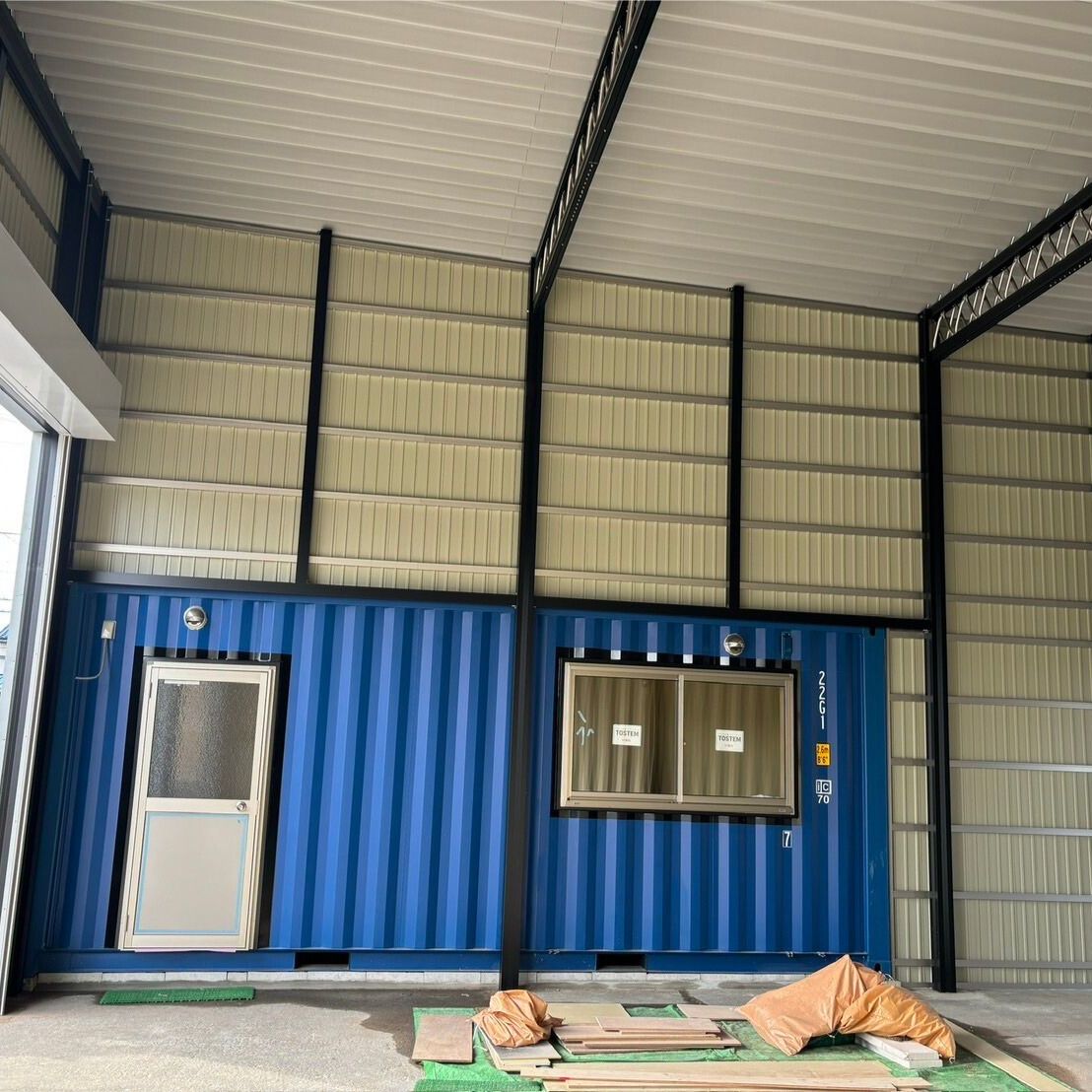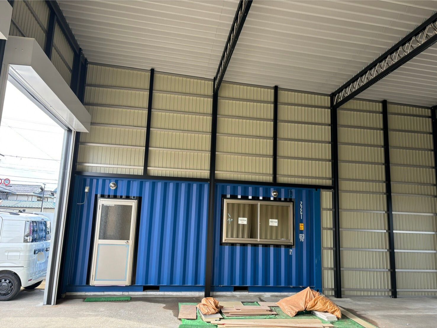 間口9m×奥行13m、高さ5m超という圧巻のスケール。重厚感のあるダブルシャッターと、外壁全面にガルバリウム鋼板板金を施し、スタイリッシュかつ高耐久なデザインに仕上がっています。