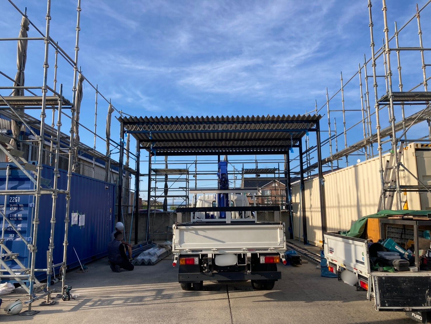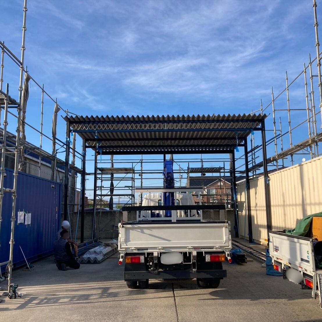 斫り作業、残土処分から始まり、セッパンカーポート組立・シャッター工事・外壁板金工事まで、全工程を2週間で完遂。