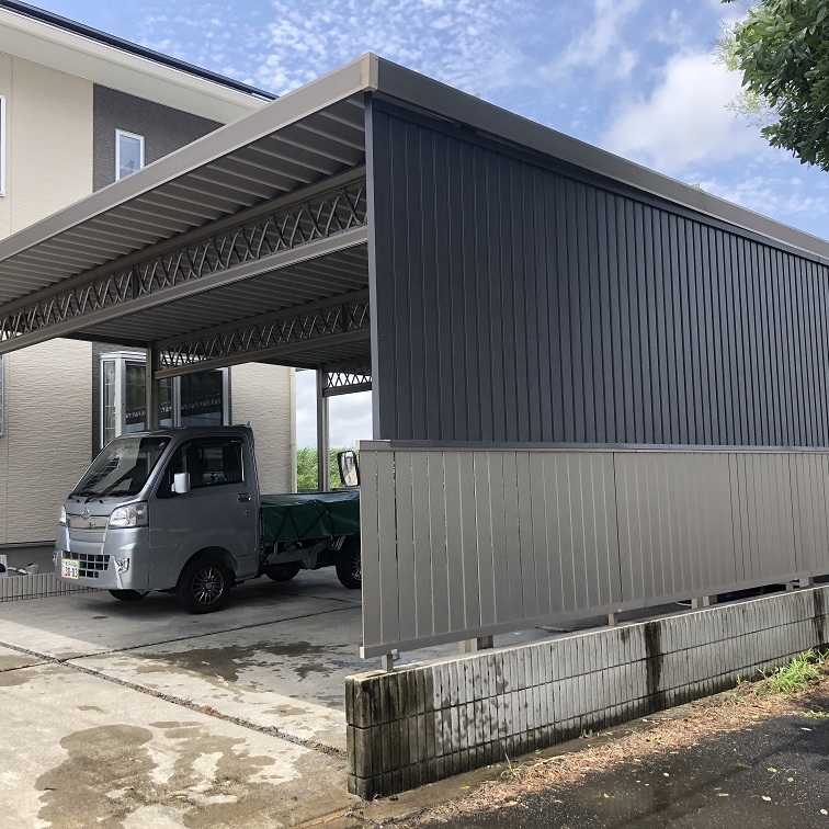 以前セッパンカーポートを設置させていただきましたお客様より側面ガルバリウム鋼板を取り付けたいとのことだったので、取付させていただきました。見た目も各段によくなり、もちろん雨が当たりづらくなったので、使い勝手もよくなりました。また背面のときも宜しくお願い致します。