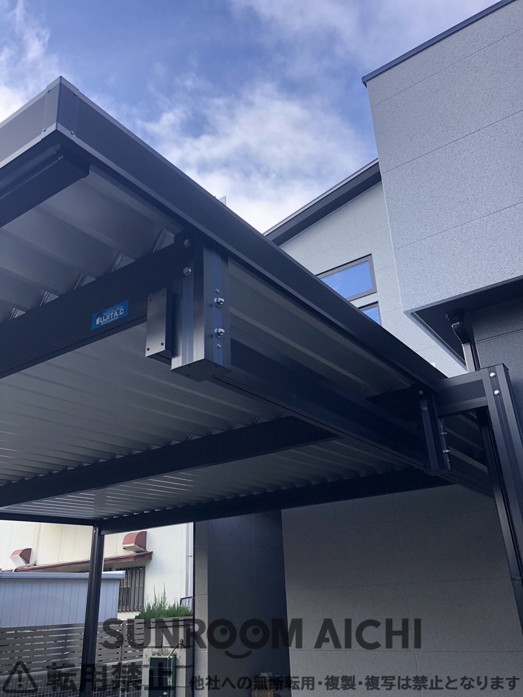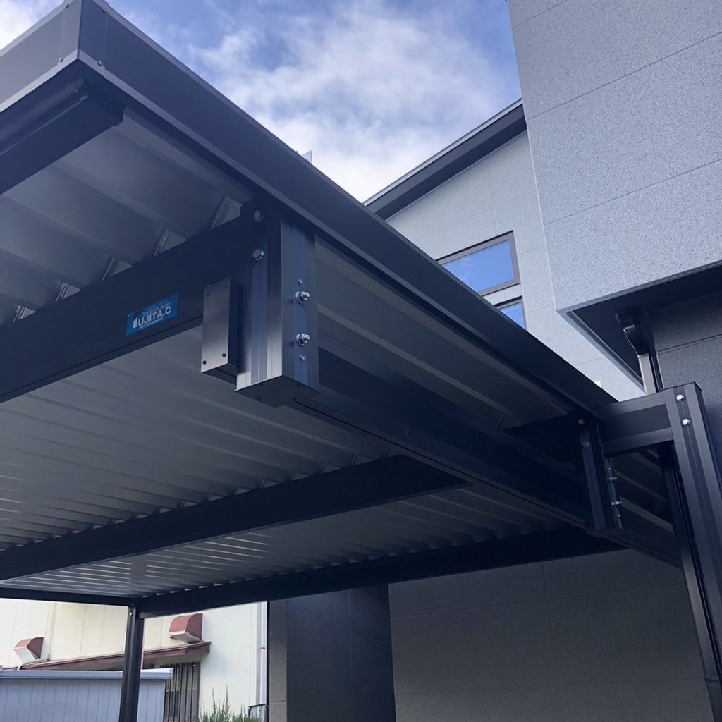 セッパンカーポートシェルポート2台用 駐車の際に柱が邪魔にならないように梁、柱の位置を工夫して対応しております。1棟ずつオーダーで採寸、制作して施工いたします。