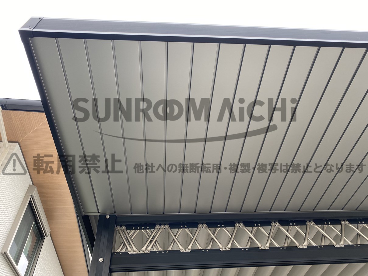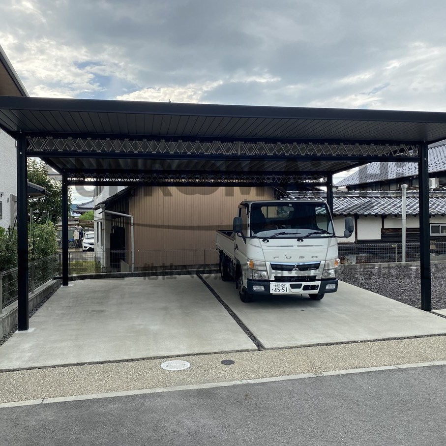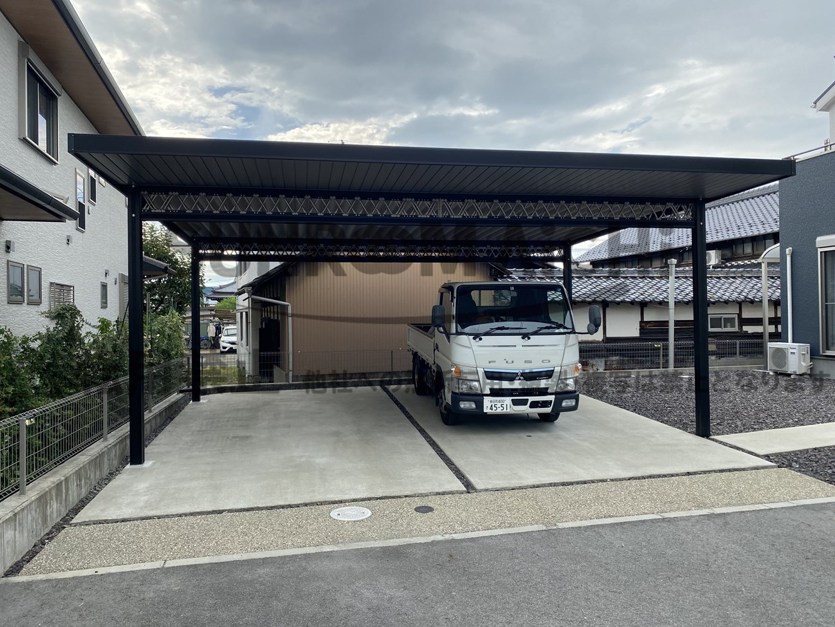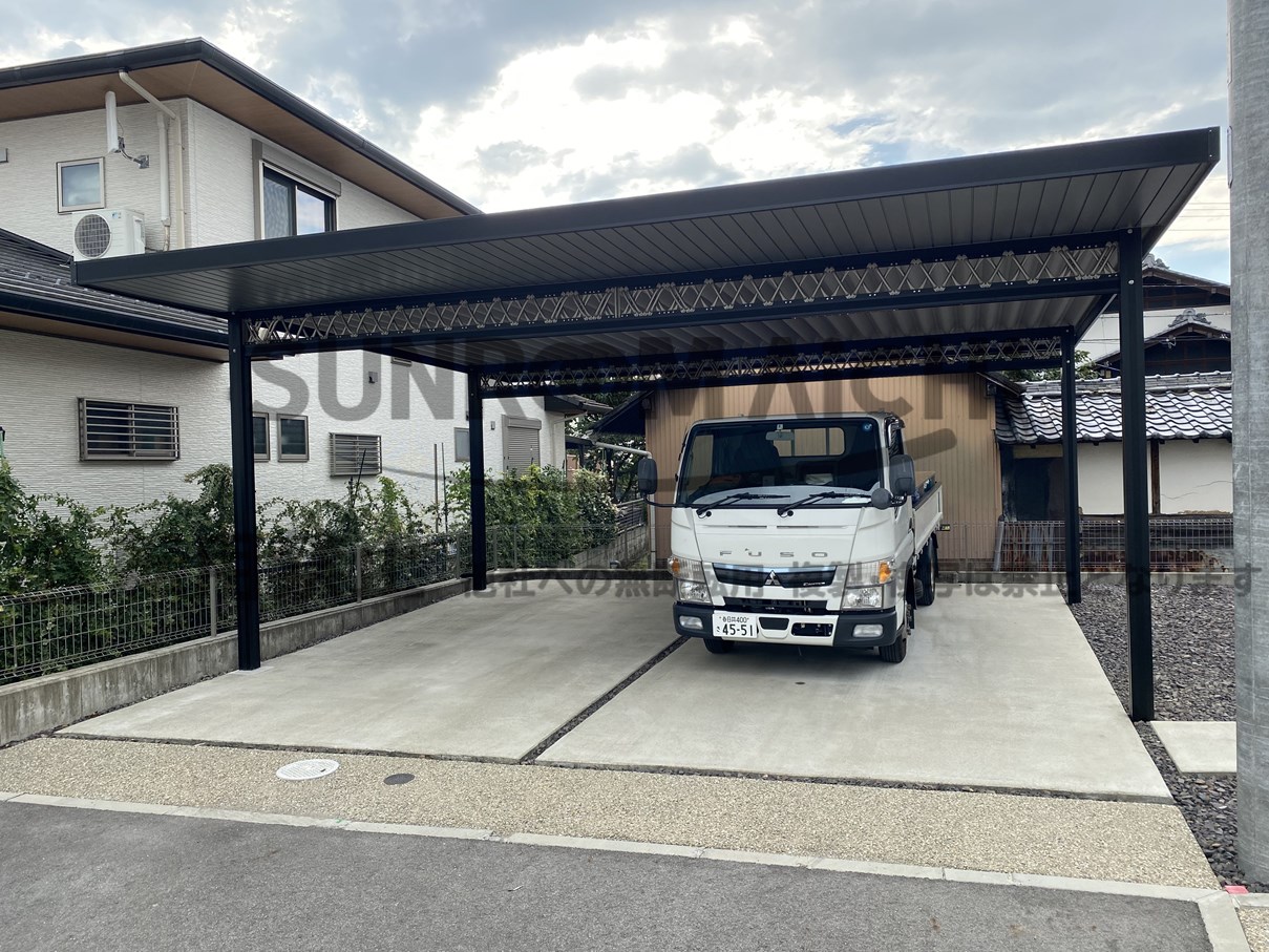 セッパンカーポート シェルポートに天井貼り工事の施工例です!シェルポートSP(前側のみ)仕様となります。本体がブラックで、梁のトラスと天井はシャイングレー系のツートンカラーです。シックでエクステリアを惹きたてます。