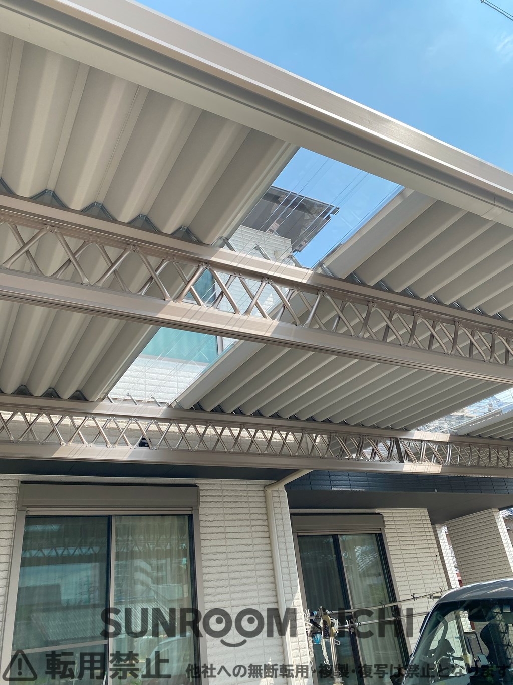 間口大型のセッパンカーポートシェルポートの施工例です。ご紹介いただきました、ありがとうございます。ポリカ屋根も採用して、見た目もよく、オーダー寸法、オーダーでトラス梁を制作してオンリーワン商品を施工しております。