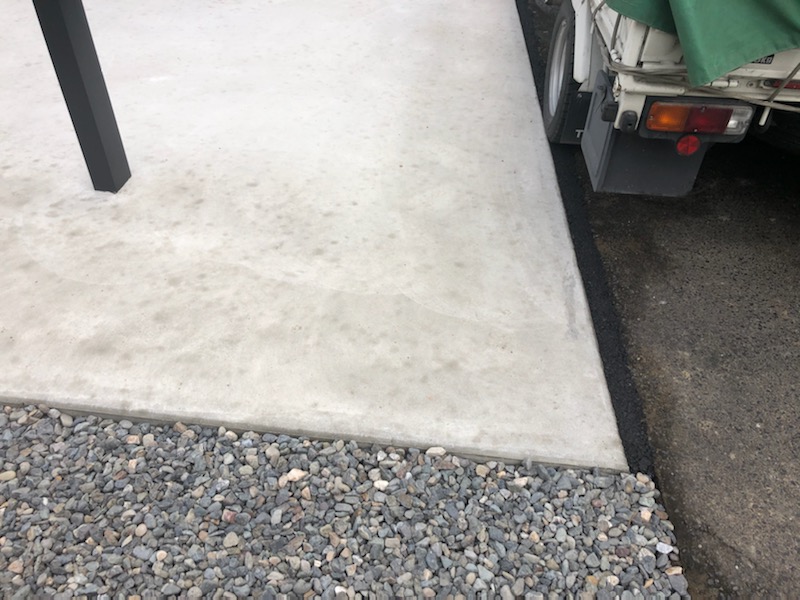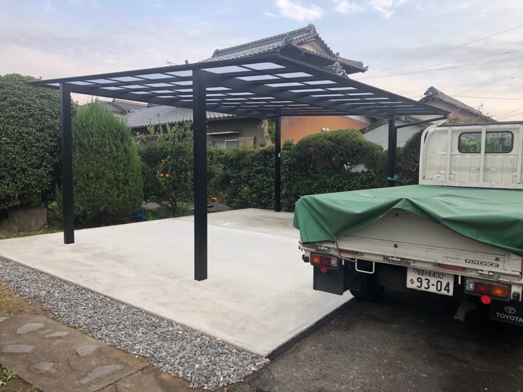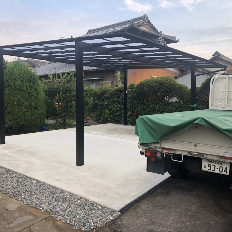 | 施工内容 | 既存物置、植栽の解体撤去 残土鋤取り 整地転圧リサイクルまき 土間コンクリート打設 カーポート2台用施工 |