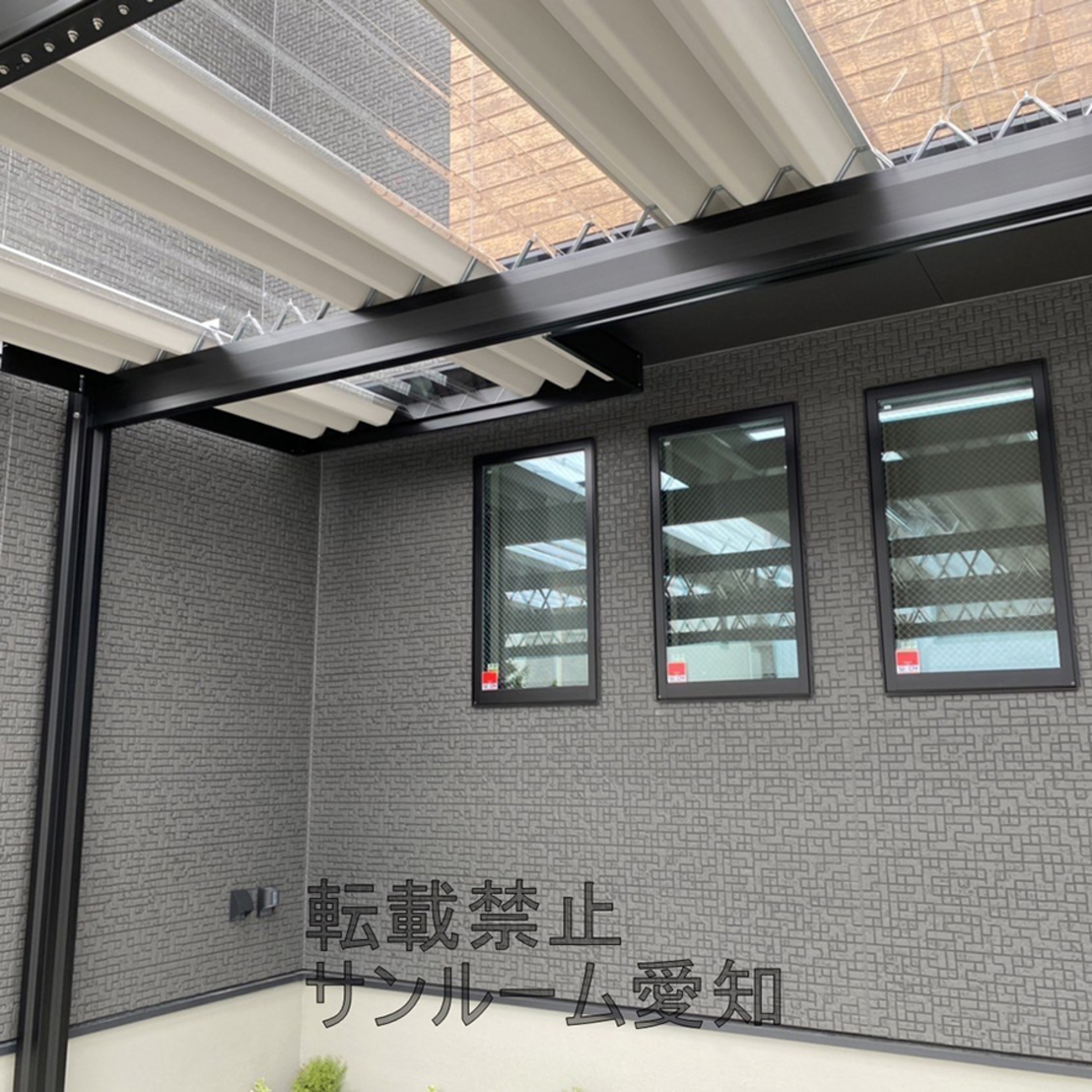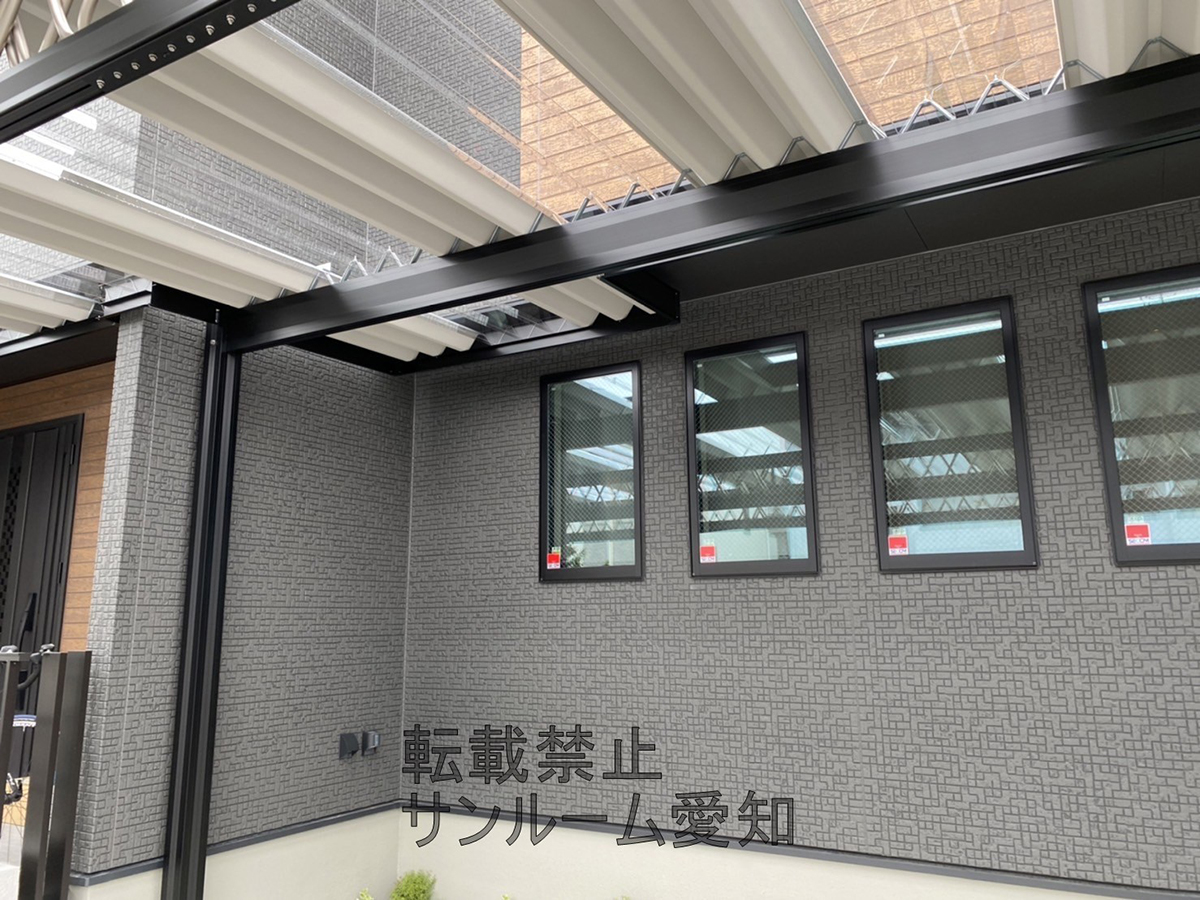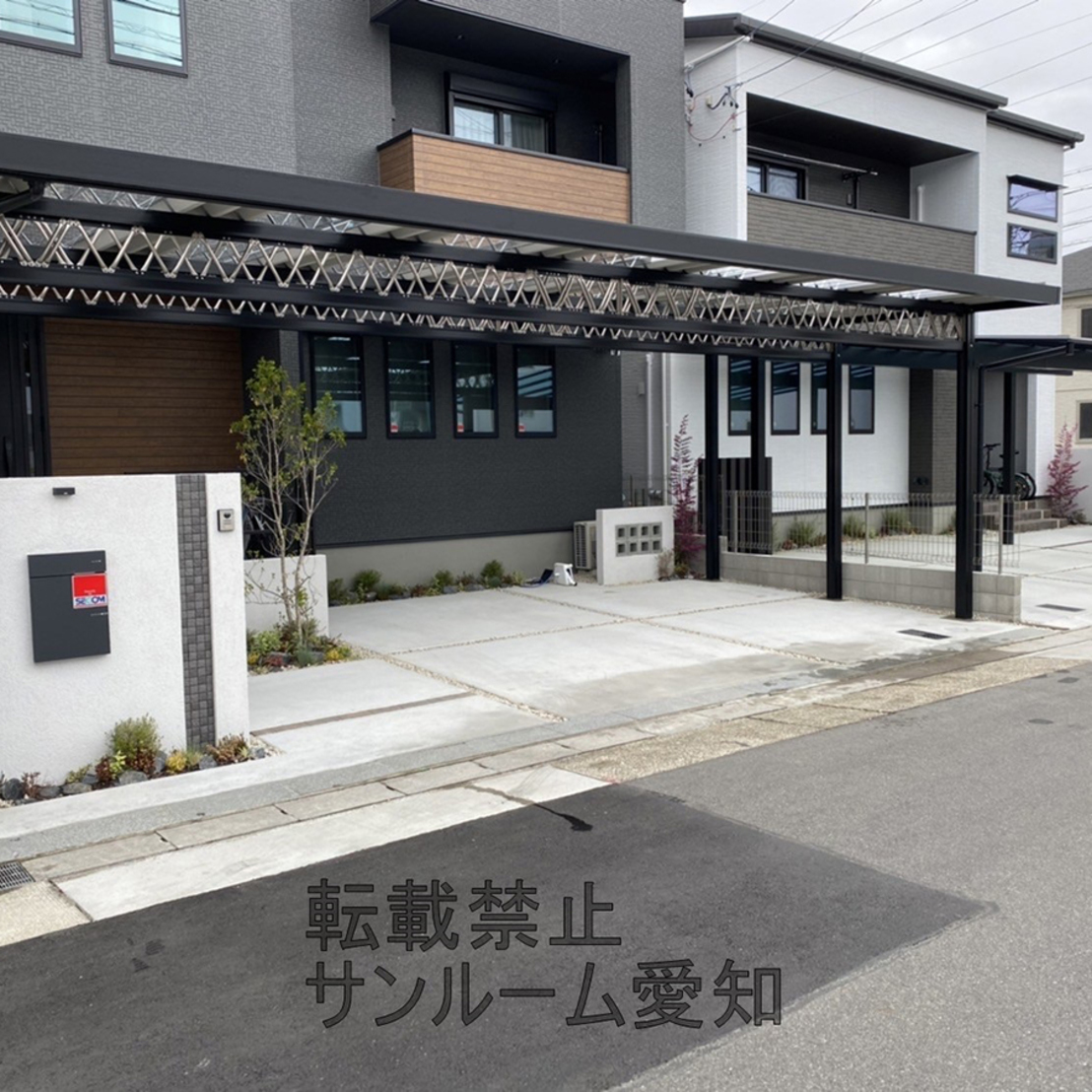 最近ブラック色の梁がツートンカラーで人気です!セッパンカーポートシェルポートの施工例です!ポリカは可能なかぎりマックスで入れています!建物3か所分奥行寸法が違いますが、それぞれ長さを変えて施工しています!これで濡れずにアプローチ部も歩けそうです!