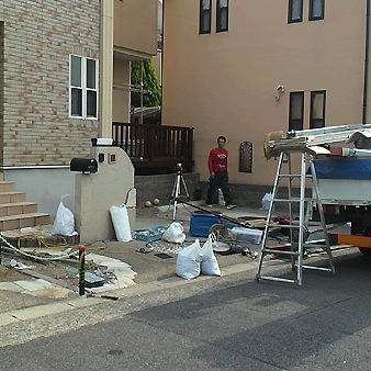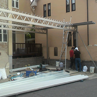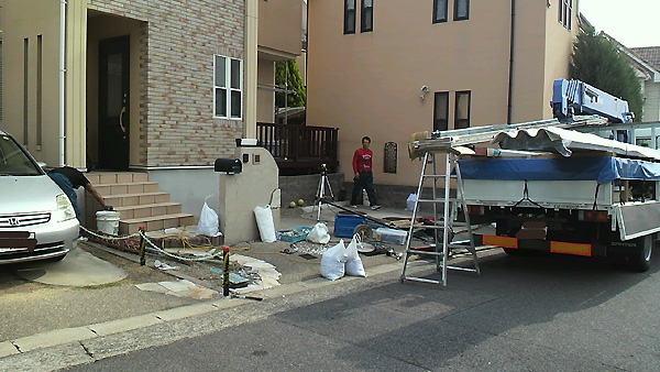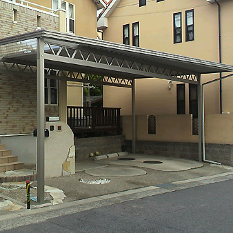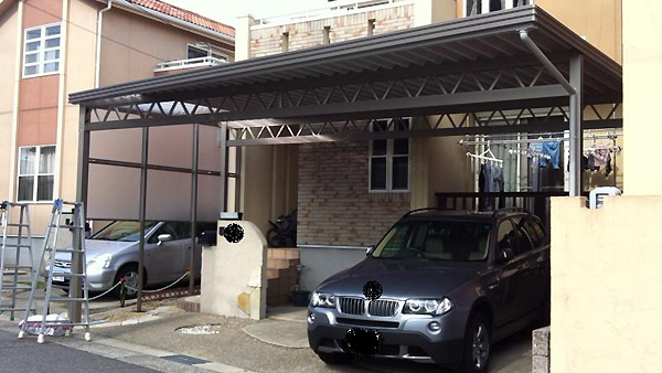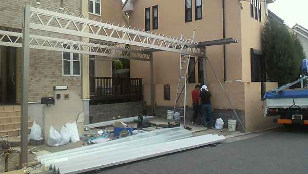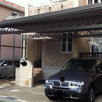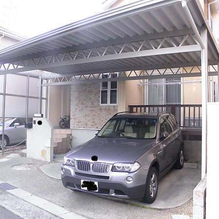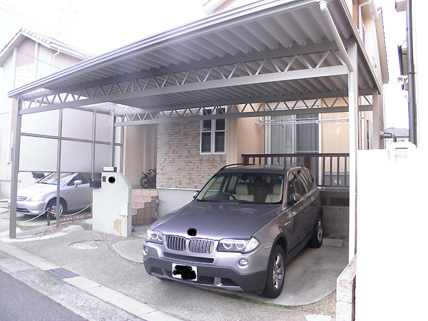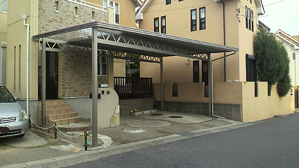 セッパンカーポートと目隠しフェンスのご注文、誠にありがとうございました。お問い合わせいただきましてから工事までに少しお時間がかかってしまい、申し訳ございませんでした。台形の敷地と同じ形でのセッパンカーポート。本当に自由設計ですね。玄関のところにはセッパン特有の暗くなりがちという弱点をクリアの屋根材に変更することで問題なく、進められました。また、目隠しフェンスには雨よけの効果もありますので、かなり有効活用ですね。玄関の上とセッパンの隙間は、余ったポリカ板を利用して、雨よけにしました。これで濡れることはもうありませんね。