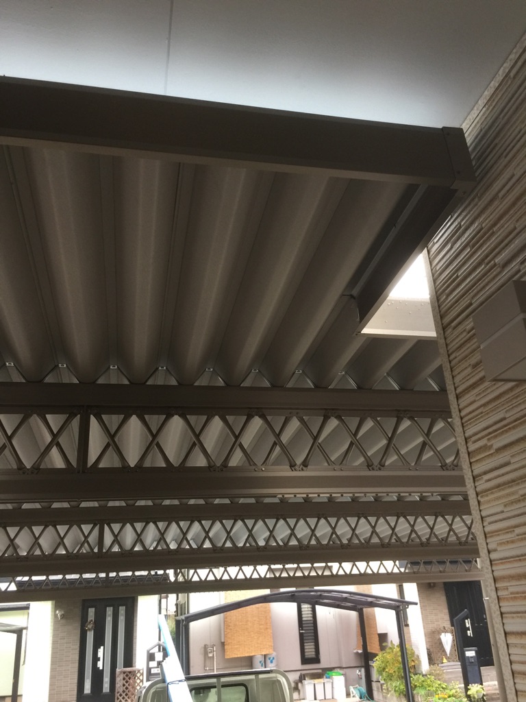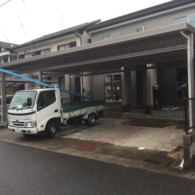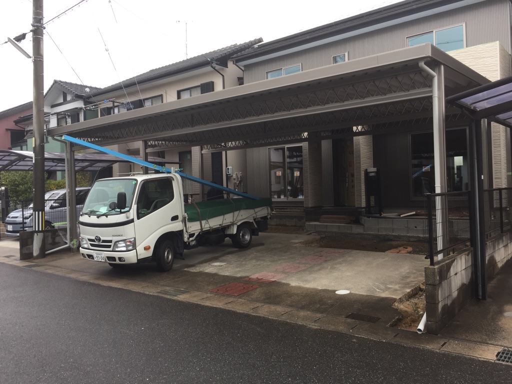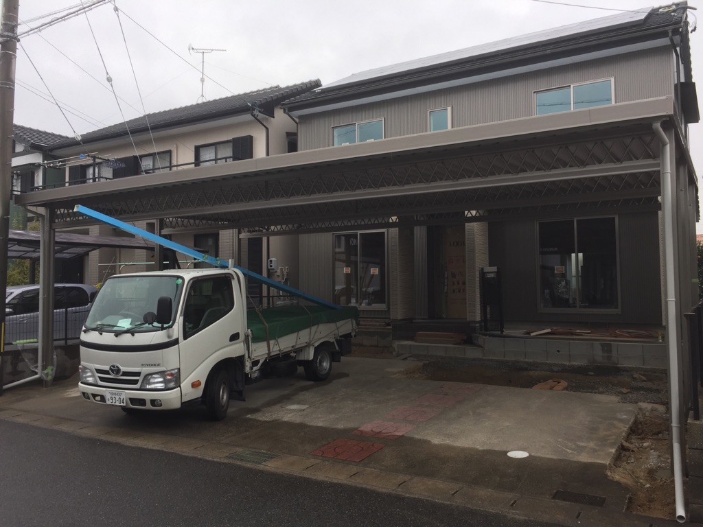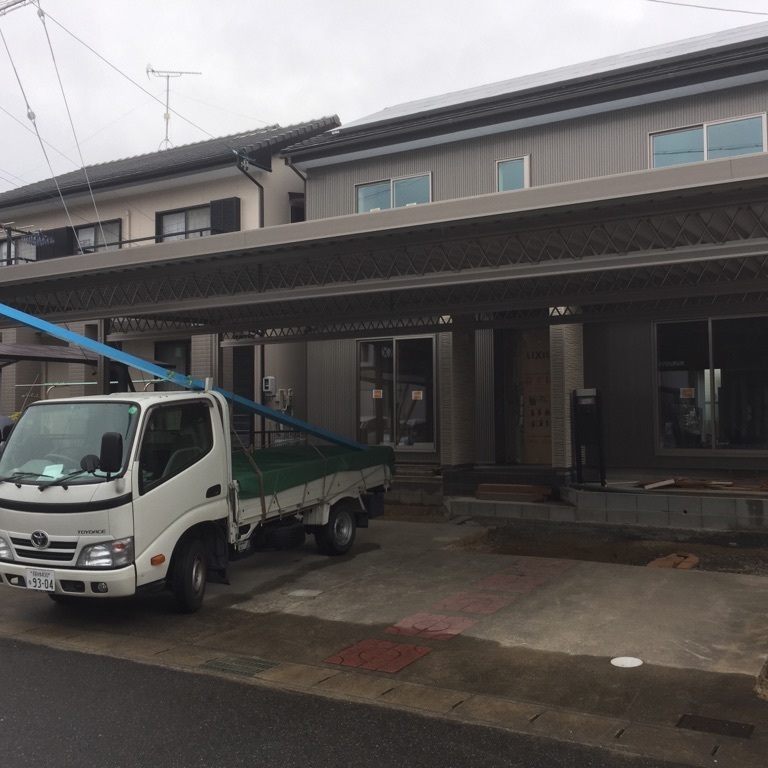 間口9mの場合、人の手では持ち運びができないので、ユニック車を使用して工事を行います。ポリカのカーポートにはない良さがセッパンのガレージにあります。もちろんその反対も言えることですが、ポリカのカーポートをご検討中の方でも、一度セッパンのガレージもご検討いただいても面白いと思います!!