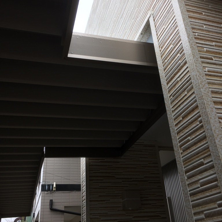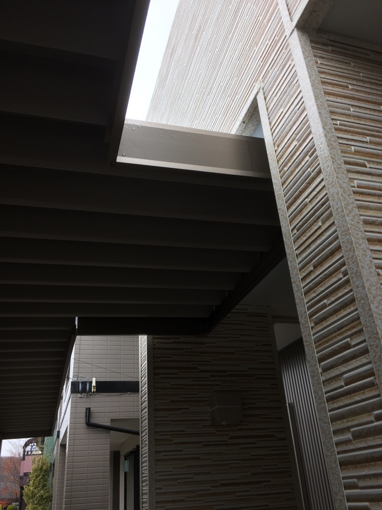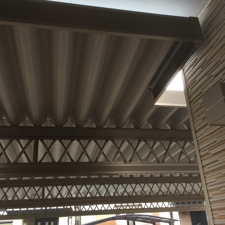 玄関部のみ、屋根を入れ込んであるので、雨の日も安心です。変則的な形に加工はシェルポートがおすすめです。