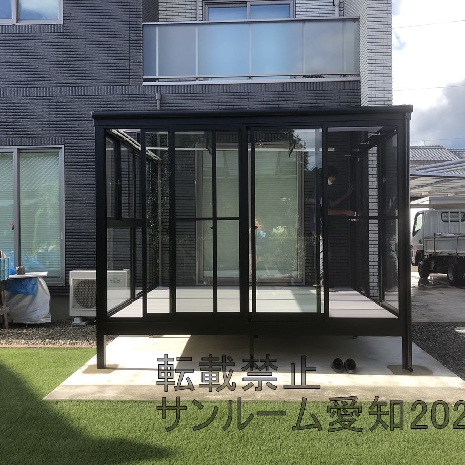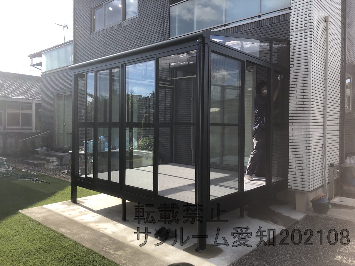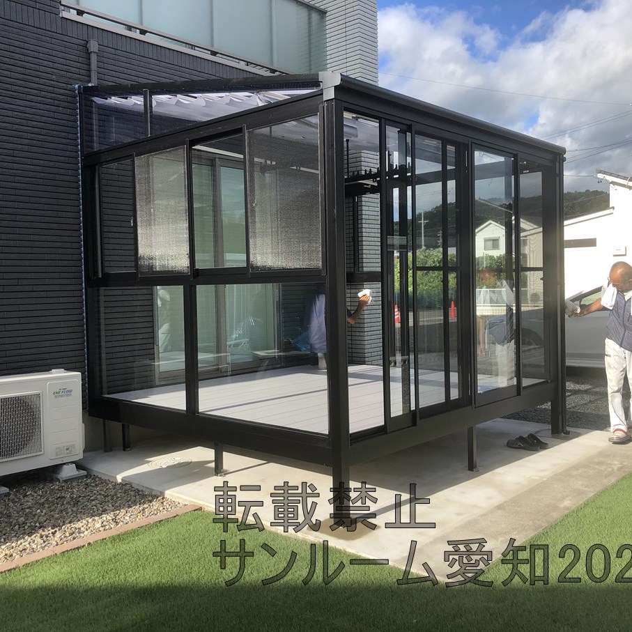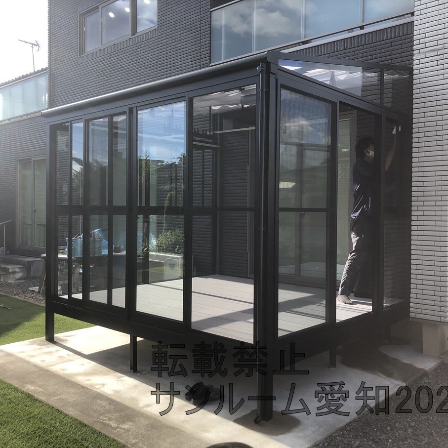 LIXILサニージュ床納まりの施工例です。2.0間×9尺(間口3.6m×奥行2.7m)の大サイズです。内部日除けもついて中で快適に活用できそうです。☆外壁タイルは雨漏りするリスクがあります。ご了承ください。