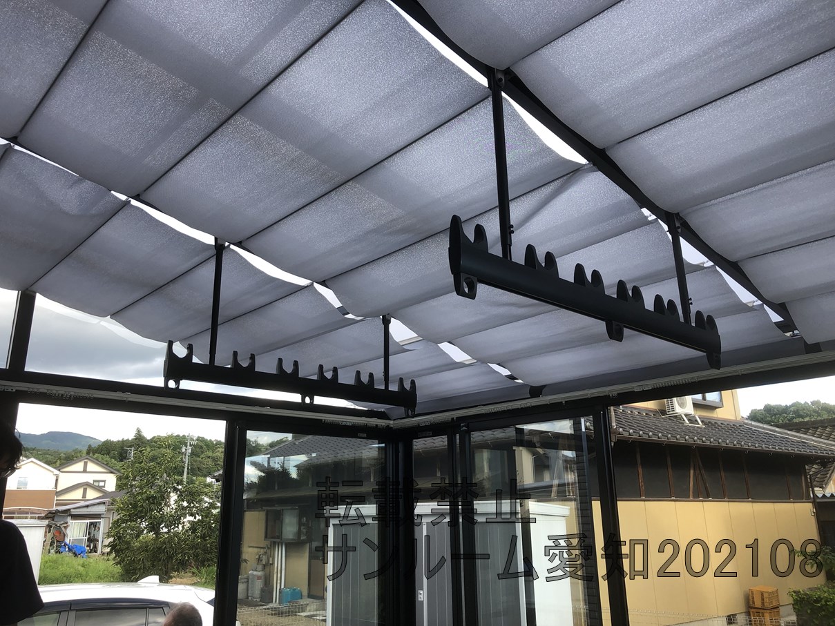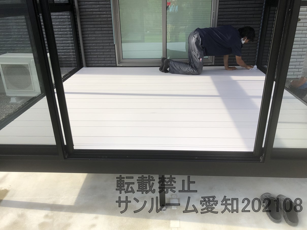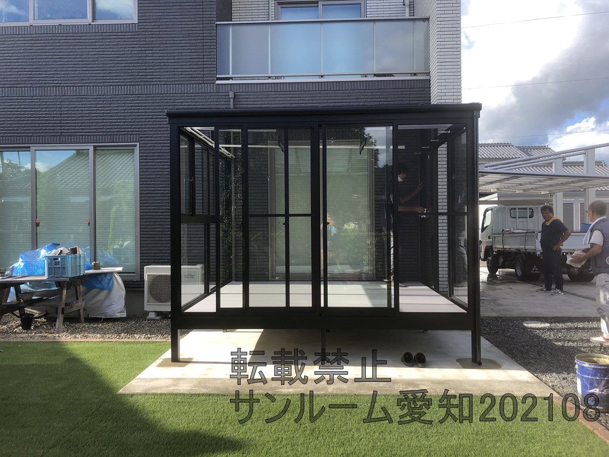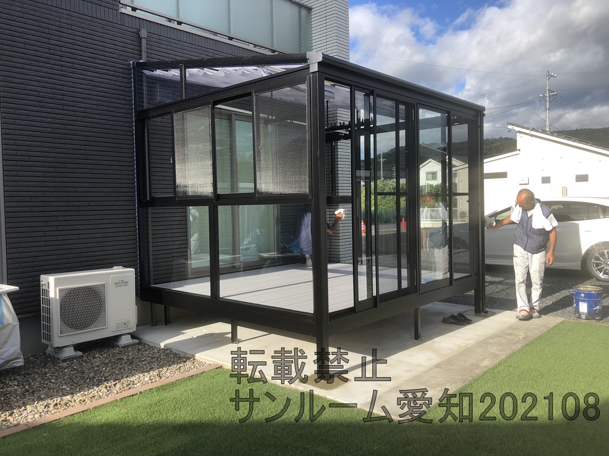 LIXILサニージュ床納まりの施工例です。2.0間×9尺(間口3.6m×奥行2.7m)の大サイズです。内部日除けもついて中で快適に活用できそうです。☆外壁タイルは雨漏りするリスクがあります。ご了承ください。