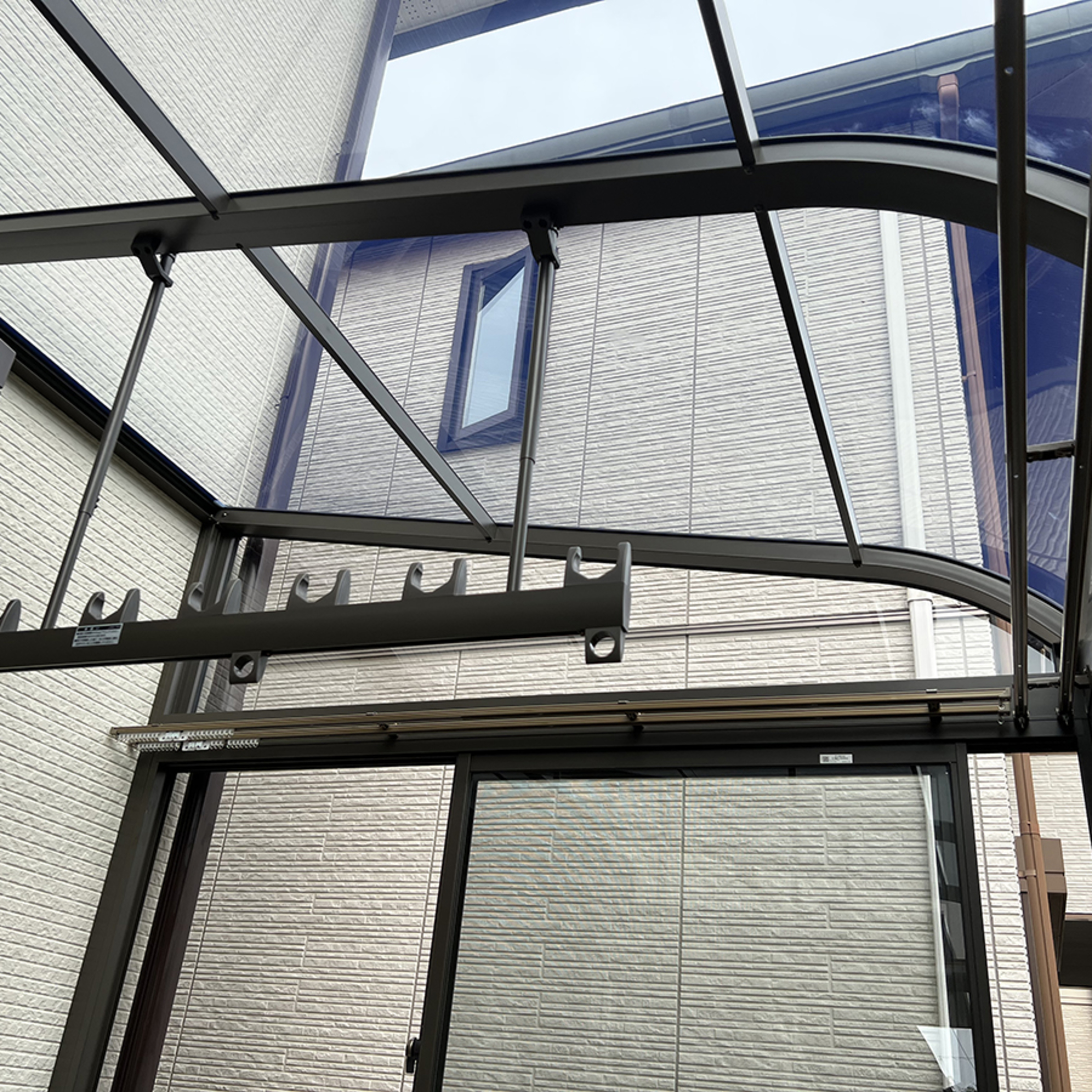 標準のサンルームの施工例です!オータムブラウン色がかっこいい!床人工木は高級品です!カーテンレールとワイド物干しもついて使い勝手が良さそう!