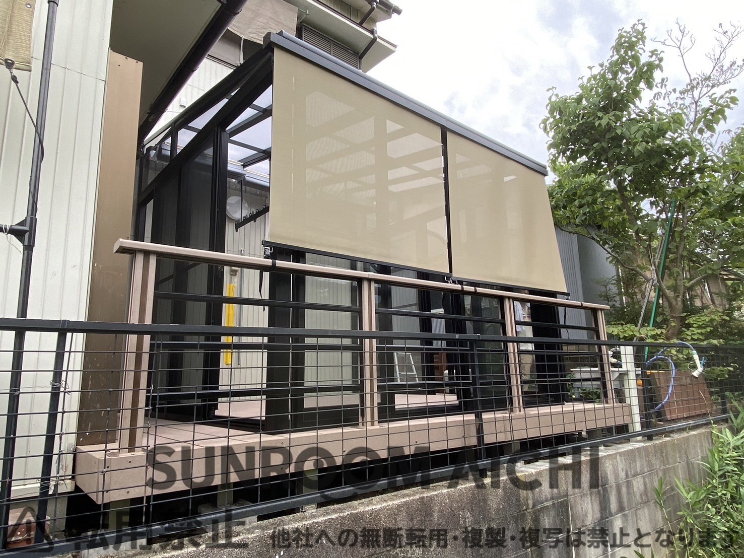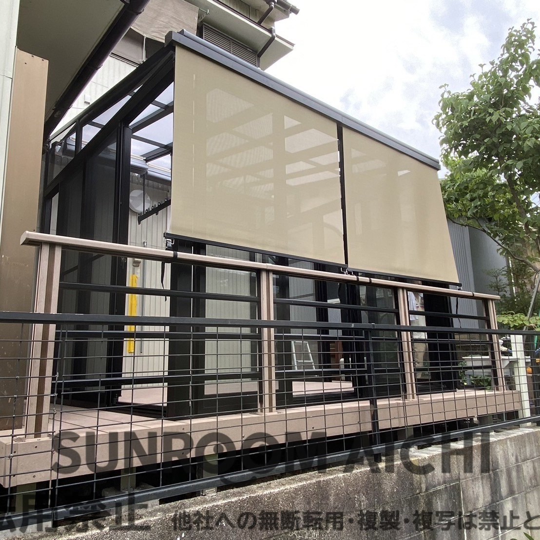 名古屋エリアLIXILサニージュ床納まり 周り人工木床ウッドデッキ仕様 スタイルシェード付き 既存ウッドデッキ、既存サンルーム解体撤去処分