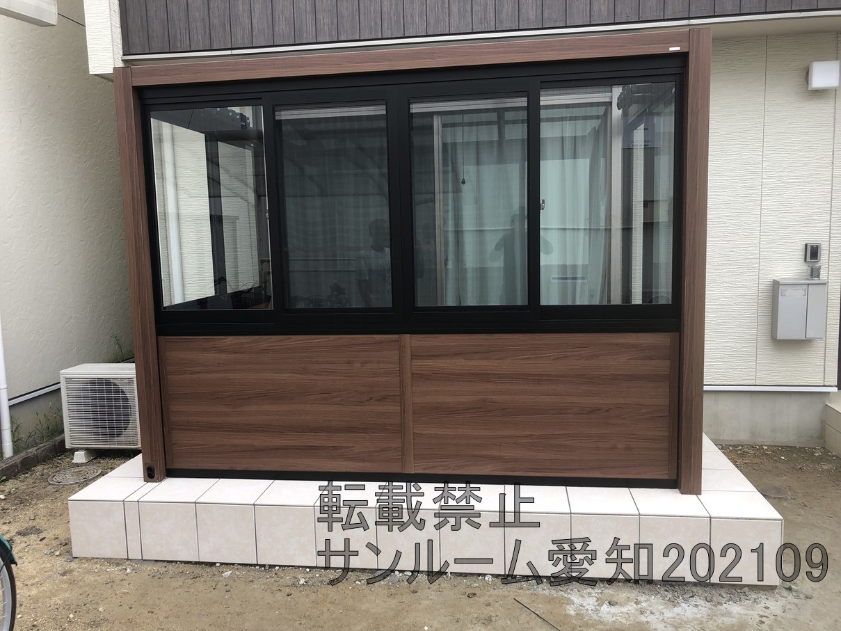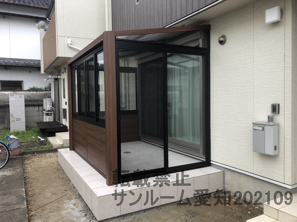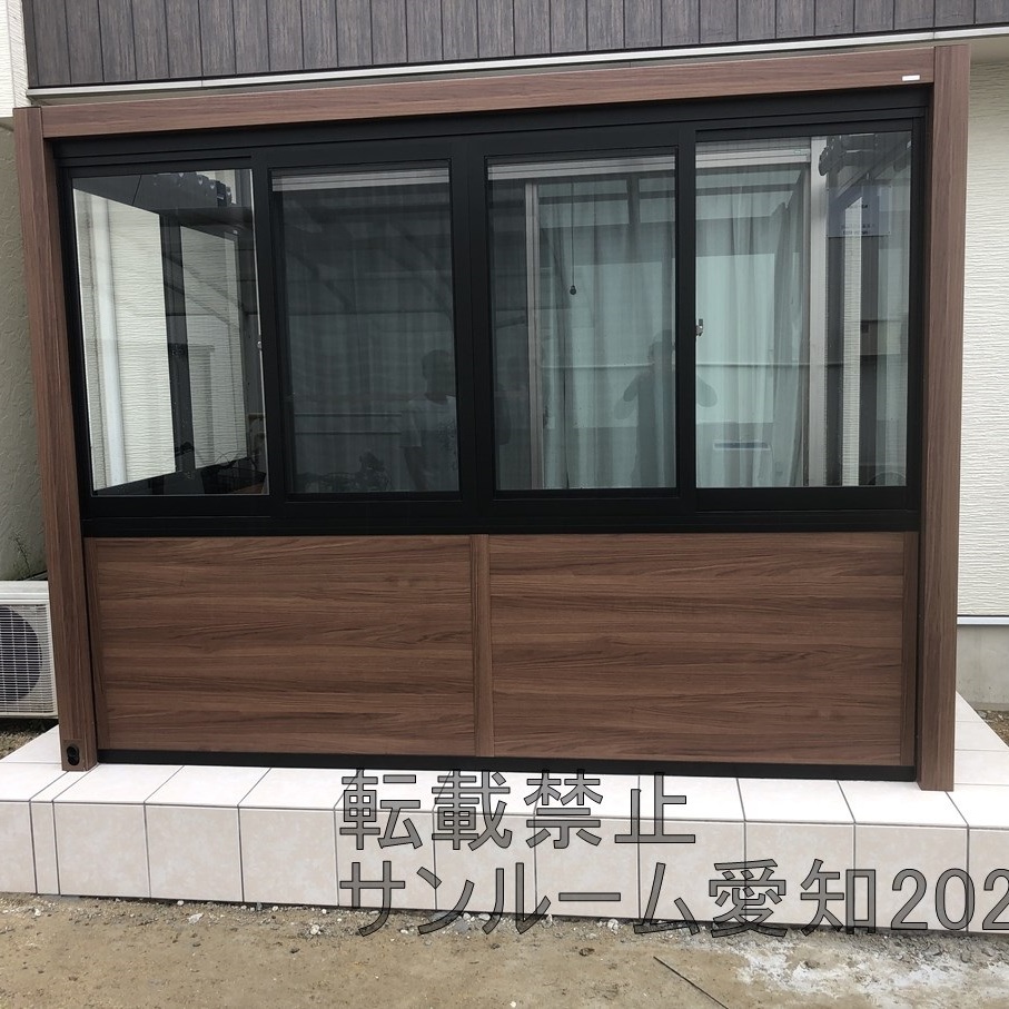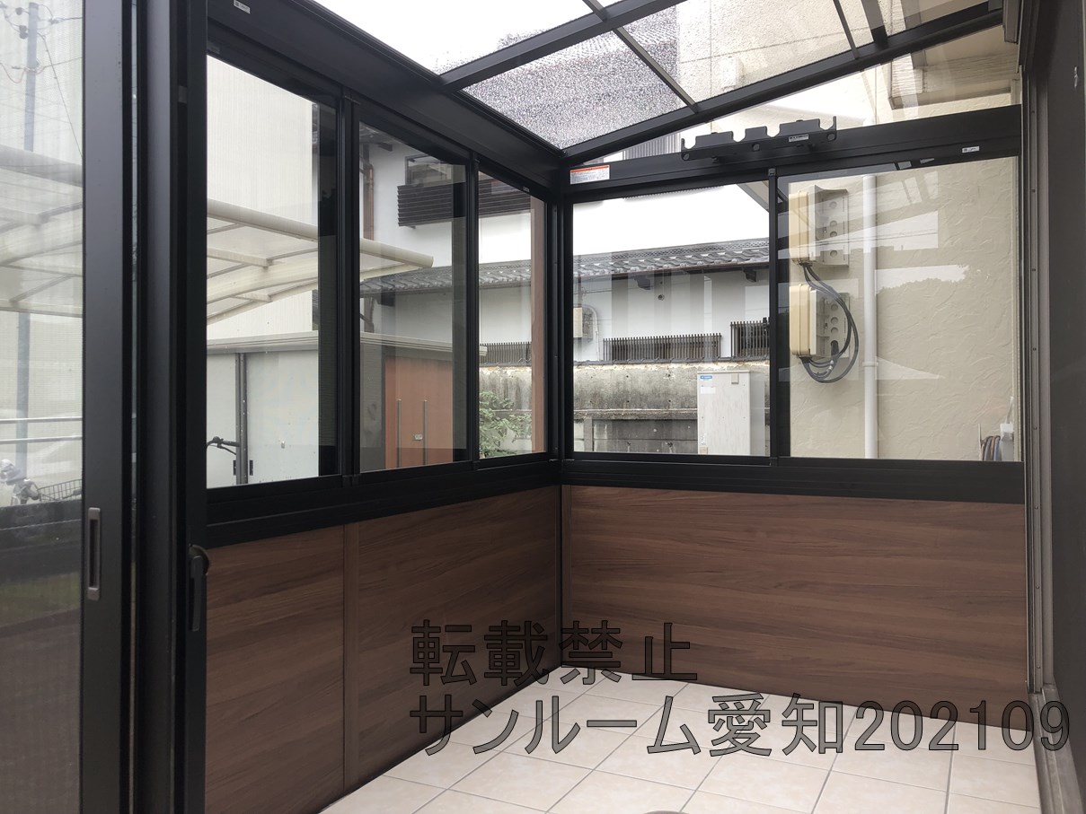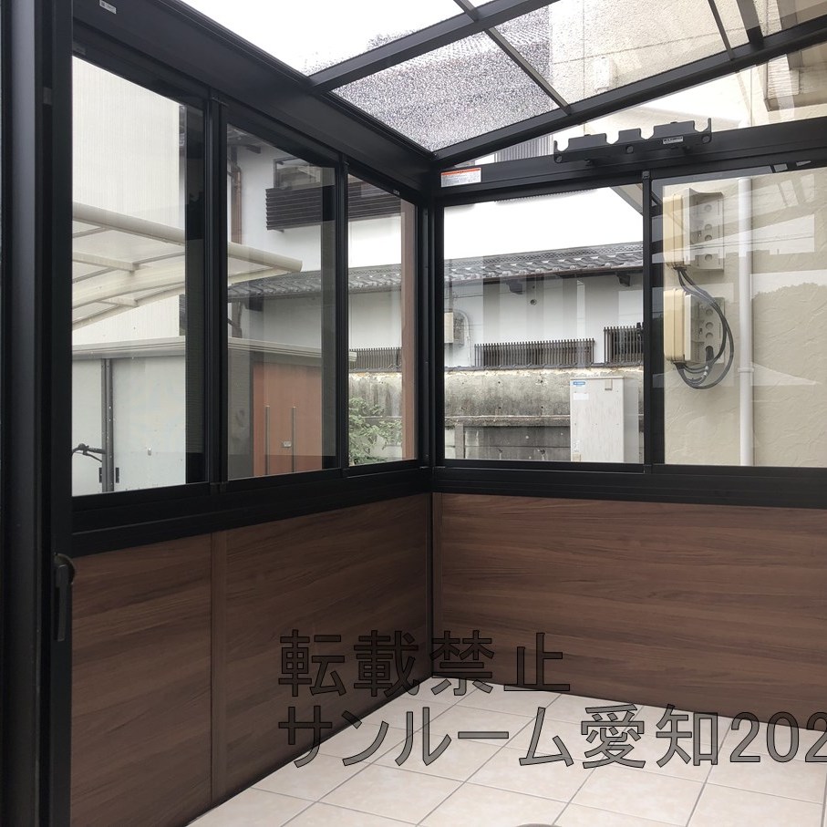 今めっちゃ出ているLIXILのガーデンルームGFの施工例です。当社でも施工例が多くなっています!腰壁も2か所ついていてめっちゃおしゃれです。床はホワイト系のタイルですごくきれいですね。屋根の部分は取付が通常では不可なため、加工して対応しています。