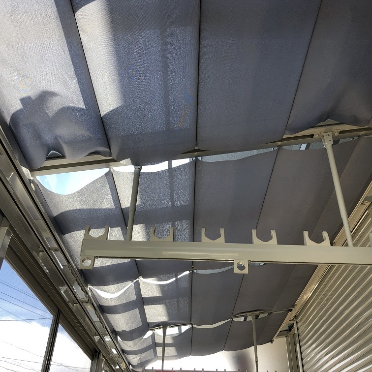 LIXILサニージュ床納まりの施工例です。ワイド物干し、網戸、カーテンレール、内部日除け、換気扇とオプションもたくさんです。建物シャッターボックス部加工して取付しています。