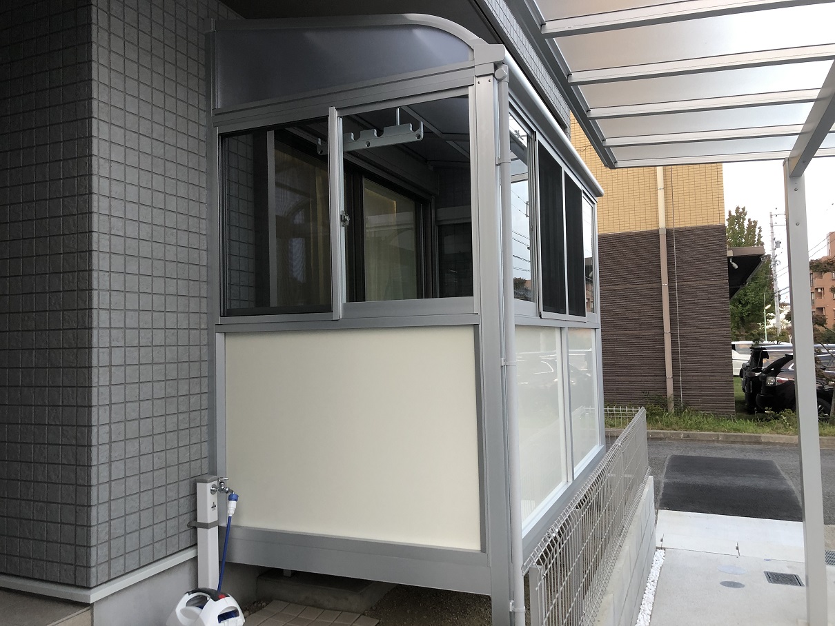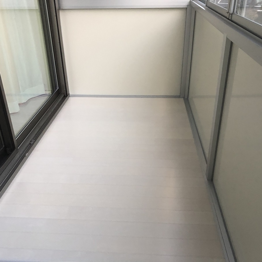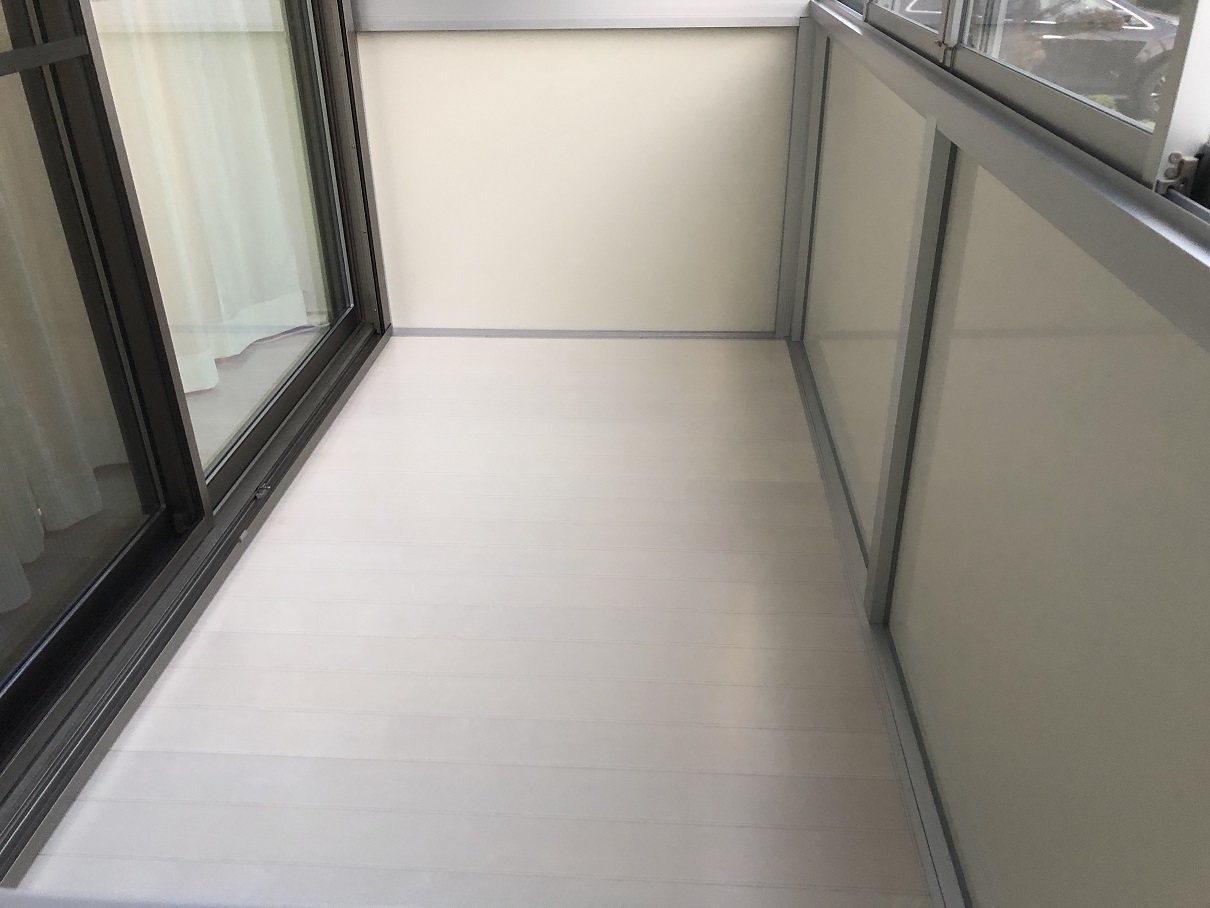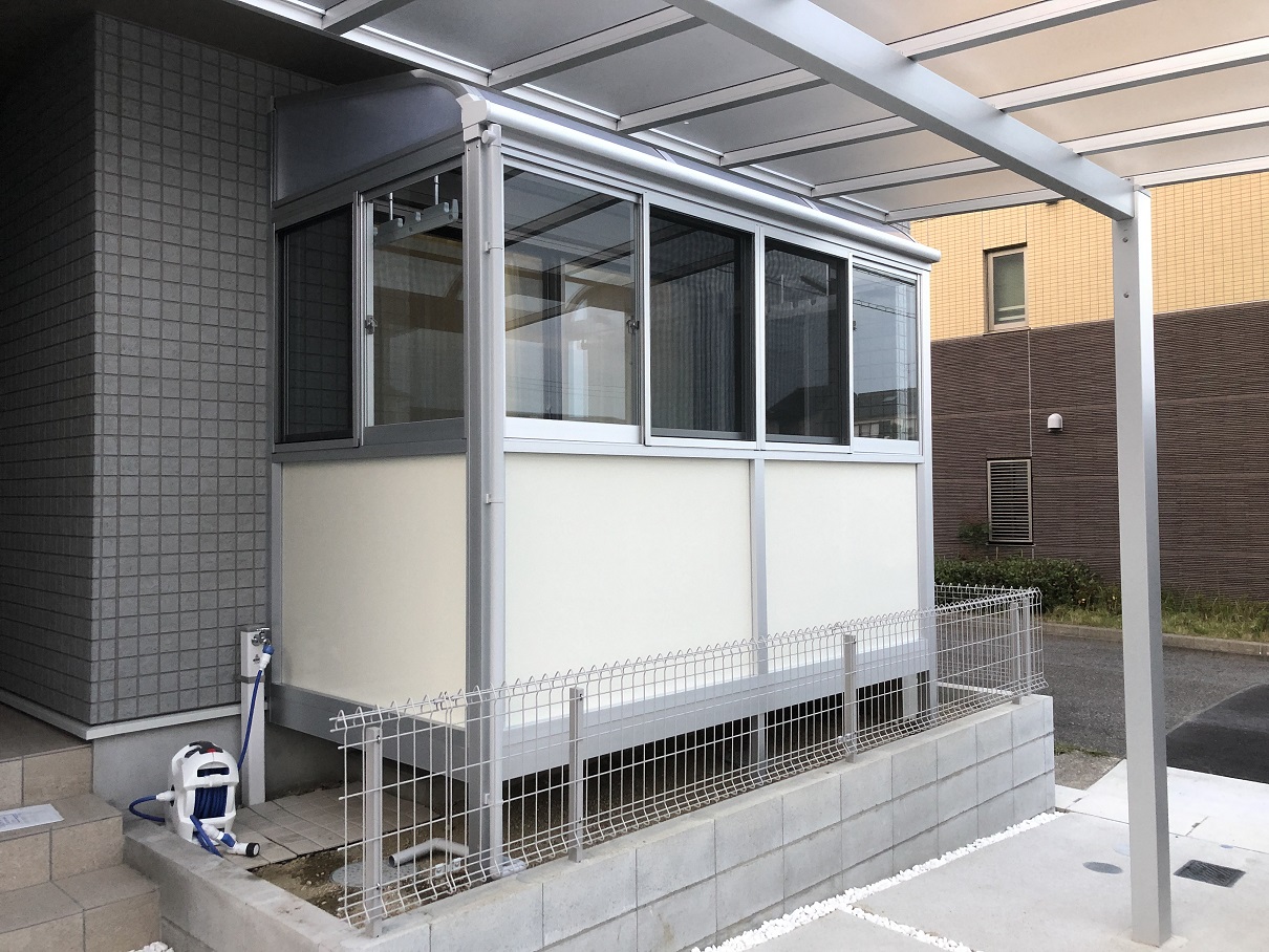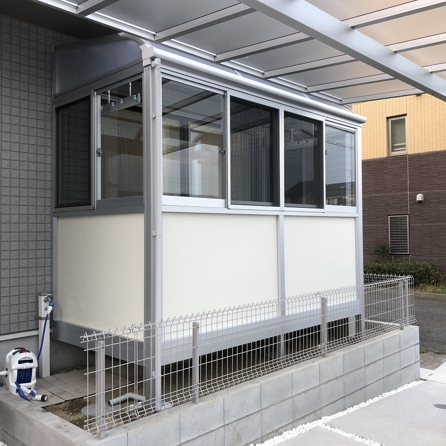 サンルーム サニージュ床納まりの施工例です。床フローリングのホワイトです!窓下は目隠しパネルホワイトです!かなりかわいいカラーですね!奥行カーポートに当たらないようにカットしています!