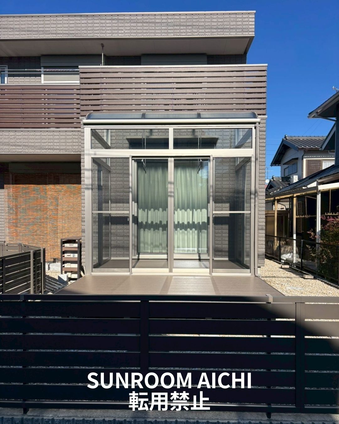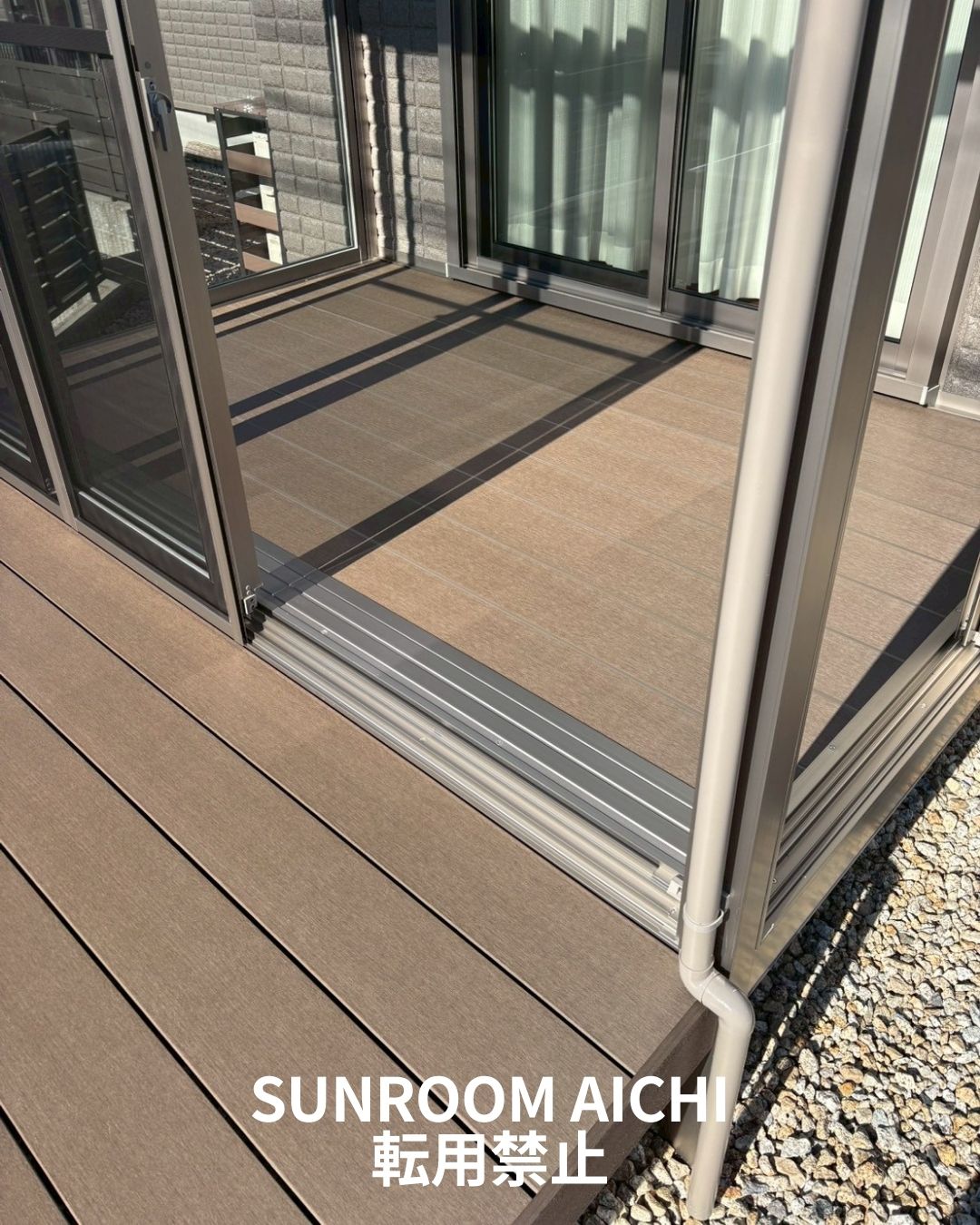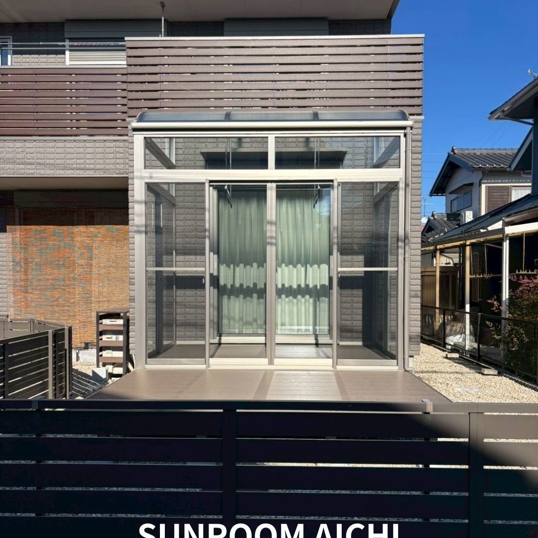 外観は、シャイングレーのサンルームとダークウッドのウッドデッキが調和し、落ち着きのある上質な雰囲気に仕上がりました。