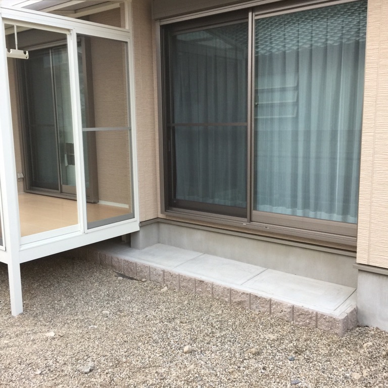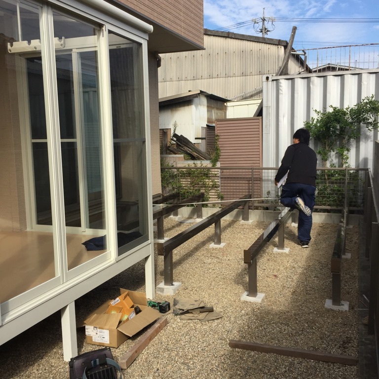 とりあえずウッドデッキが、ブロック境界までいっぱいに施工したので、広いです!そこからスムーズにサンルームに行き来できますし、かなーり使い勝手が良さそう。