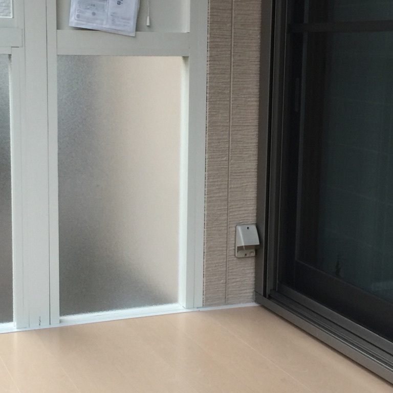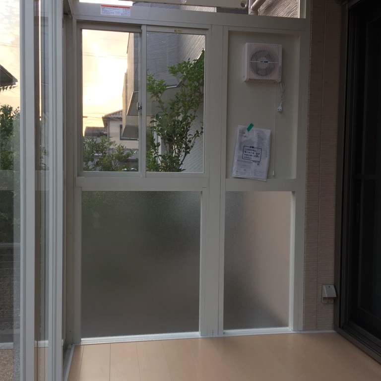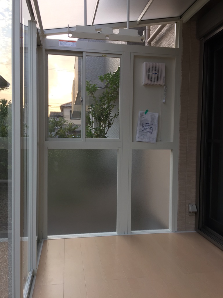 サンルームには換気扇と高窓!下はともに型ガラス(曇りガラスのような)です。換気扇のところはガラスに穴開けができないので、白いエース板を採用してます。おなじみ安定のフローリング。色もこの白っぽいものが一番選ばれているような気がします。当社ならフローリング仕様が断然おすすめです。カラーも豊富に選べますよ!