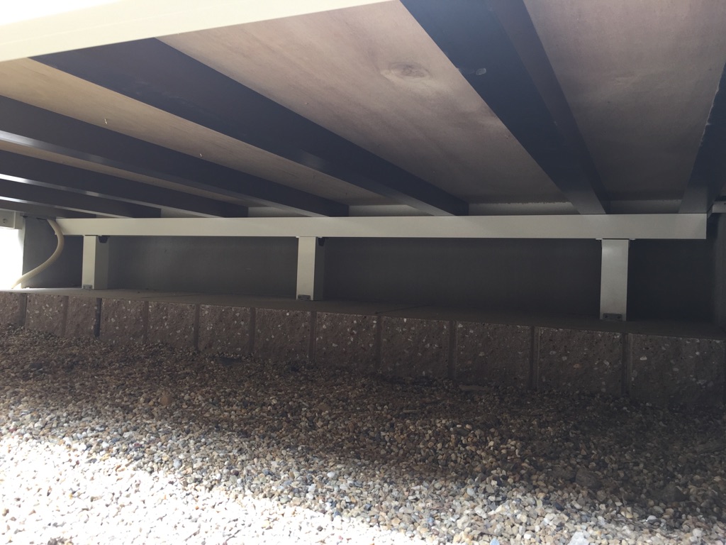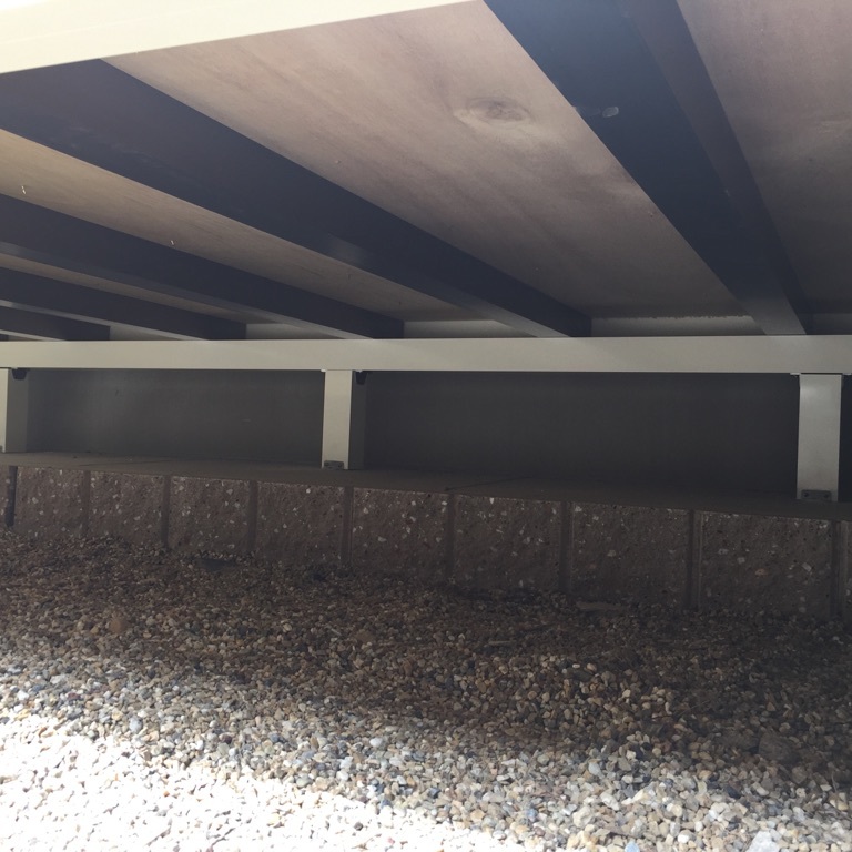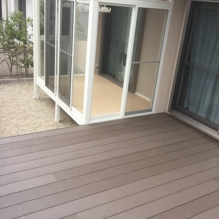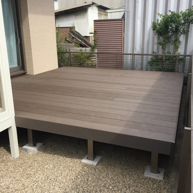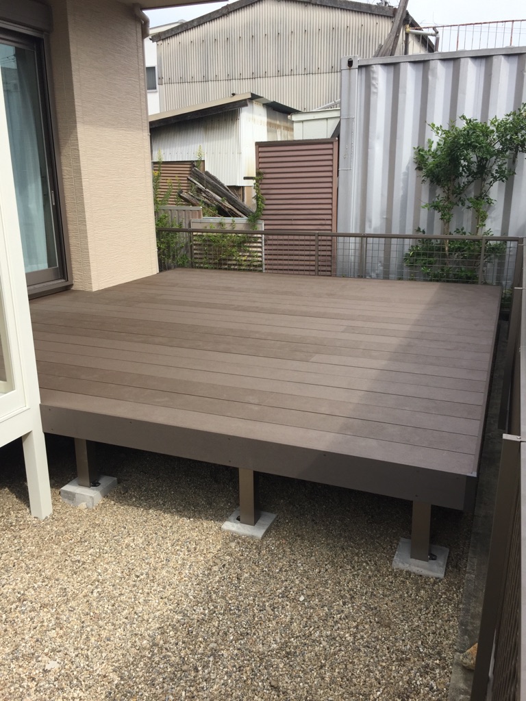 次にウッドデッキです。束石の下はセメントを敷いております。これは通常工事でこの方法を採用しております。フェンスぎりぎりまで施工させていただき、とても広いウッドデッキが出来上がりました。