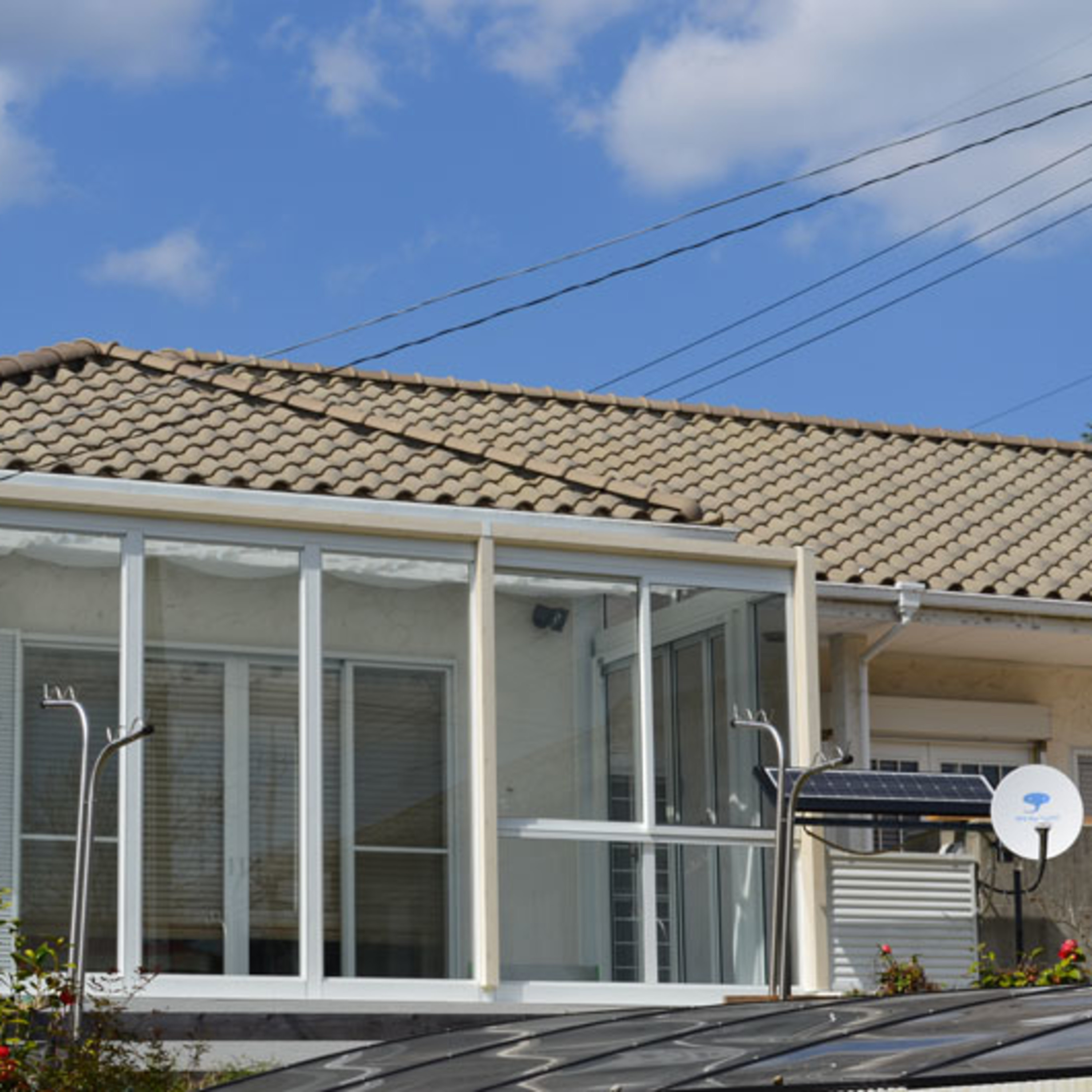 めちゃくちゃかっこいいと思いませんか?!三協アルミの高級サンルーム、ハピーナです!!本体もタイルもホワイトでかなり綺麗な仕上がりです。本体桁や柱のカバー部分に木彫も使用しております。様々なサンルームを検討しましたが、H寸法がこのハピーナが抜群に相性が良かったので採用させていただきました。