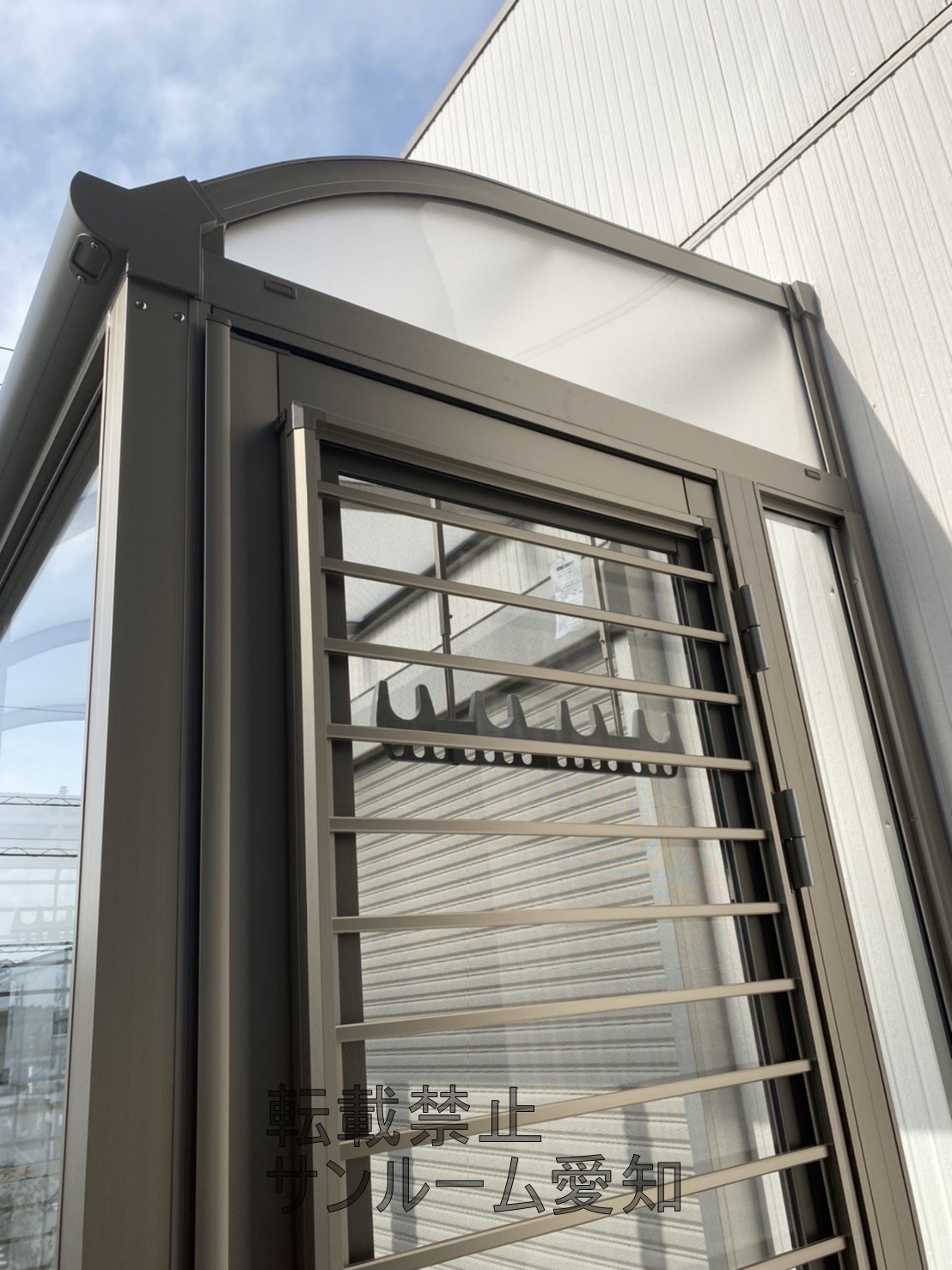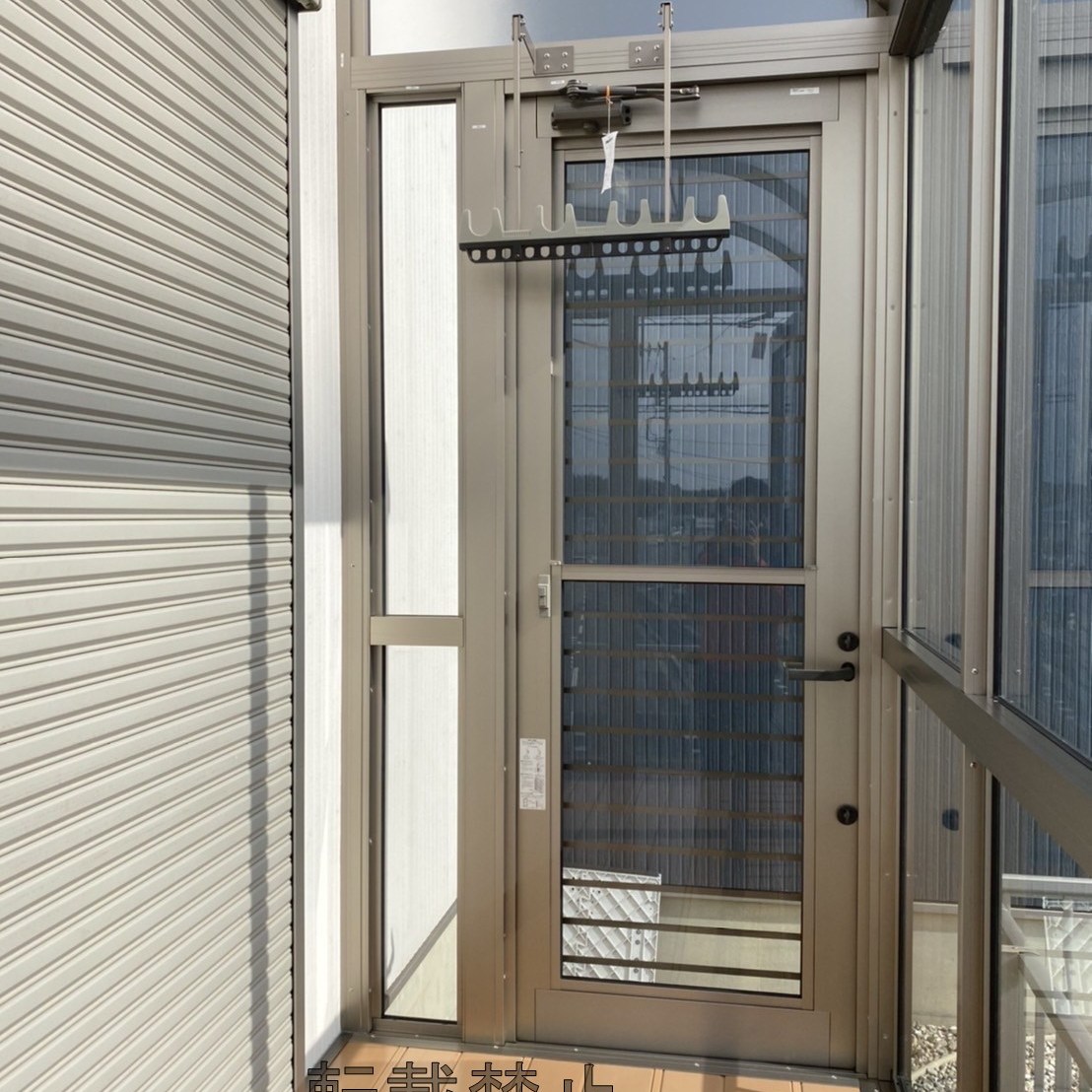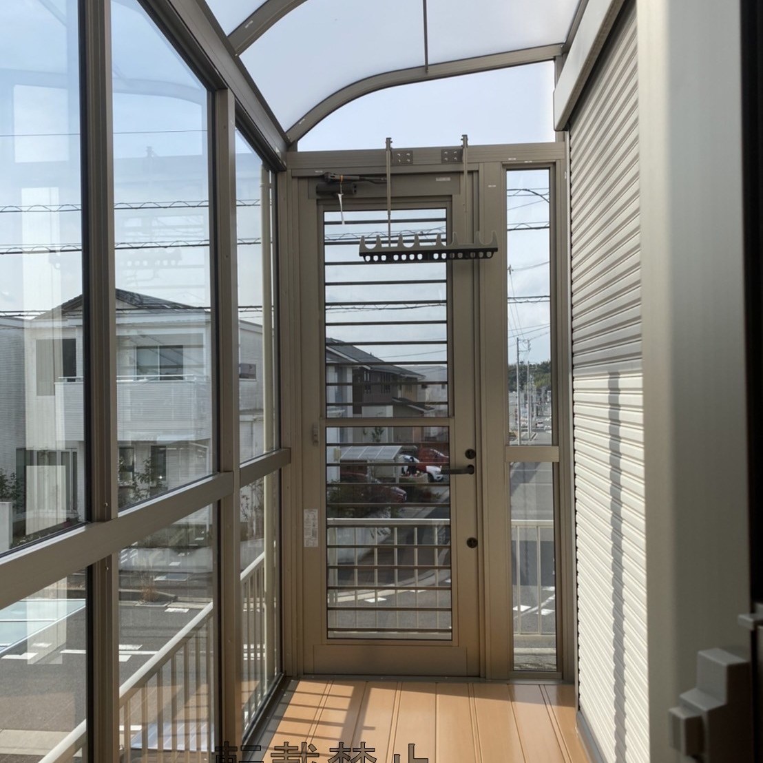 三協アルミのサンルーム、晴れもようwithの施工例です!ハイタイプがあるためこちらの商品を採用しています。前面は落下防止のため、開かないFIX窓仕様にしています。換気できるように両側面は換気機能付きのドア、彩風ドアを採用しています。網戸もついています。