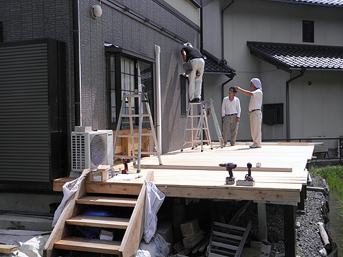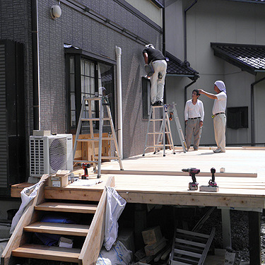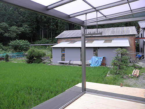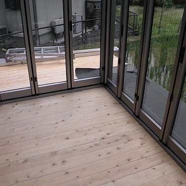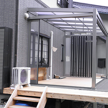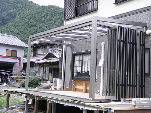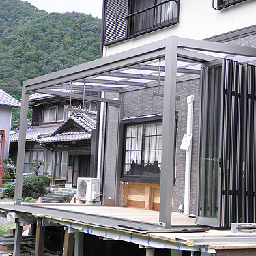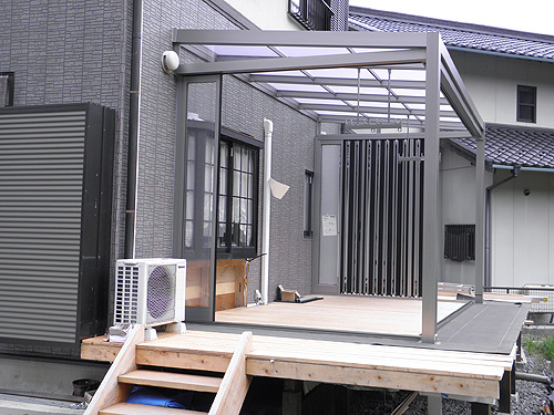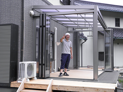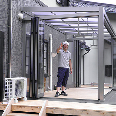 この度は、ジーマをお買い求めいただきまして、誠にありがとうございます。大工をされているということで、デッキはお客様自身で施工されました。デッキを弊社へご依頼の際はTOSTEMかTOEXより選択していただきます。また、デッキではなく、土間工事も可能です。さて、デッキのレベルを確認します。ジーマ本体の施工はさほど時間はかかりません。二日間の工事でした。ジャバラサンルーム。この開放感は施工している我々職人ですら「あ、かっこいい。こんなの自宅にもつけたい。」そう思わされました。気持ちよくご使用ください。