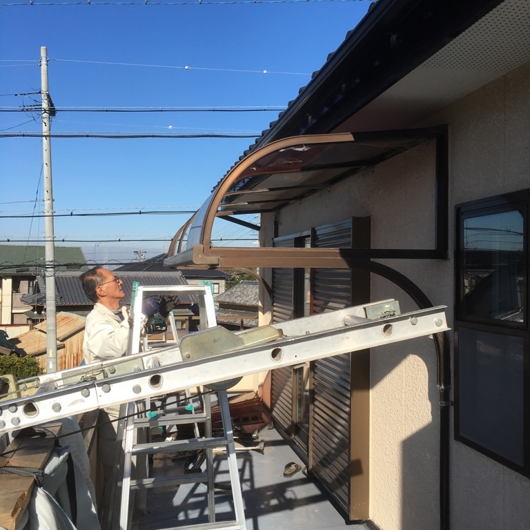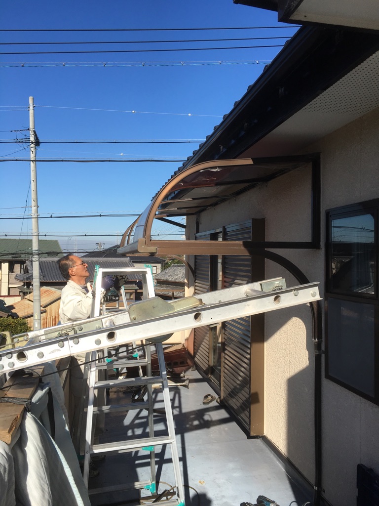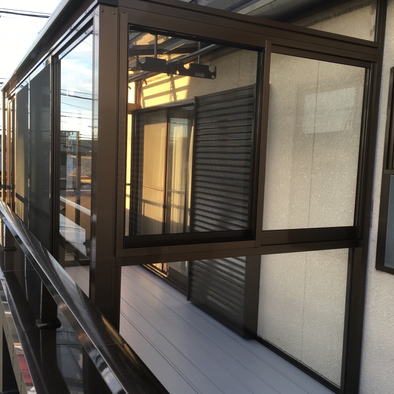 二階ベランダにサンルームを取り付けたいというご依頼。通常通りでは取付不可でしたので、妻ばり、前けた等を加工して取り付けてあります。高さもギリギリだったので結構苦労しました。元々古いテラスが取り付けてあったのですが解体・撤去致しました。
