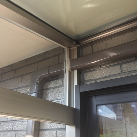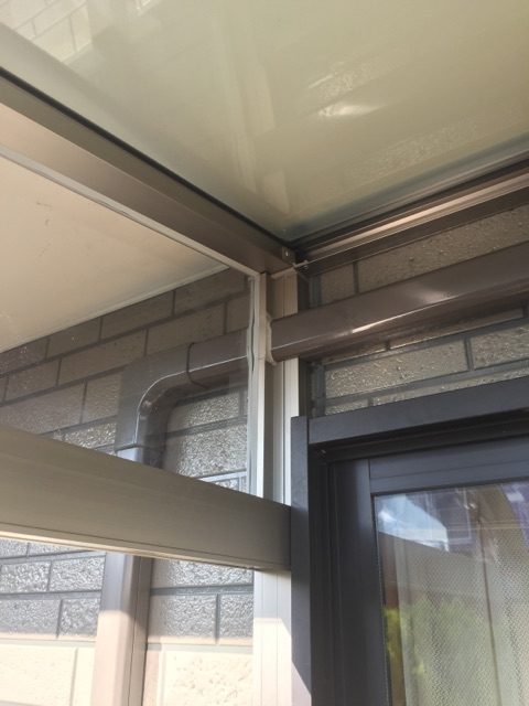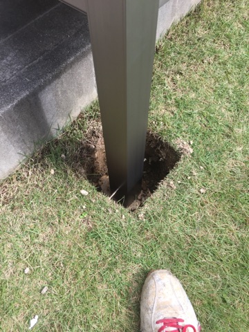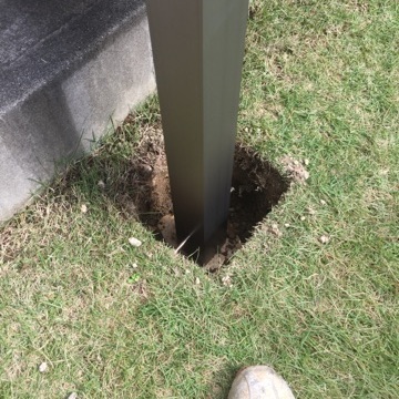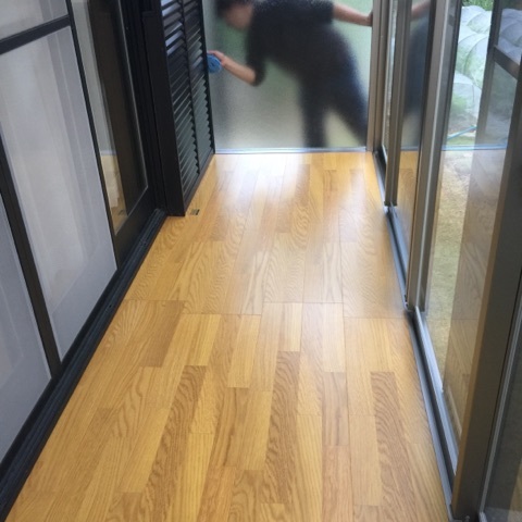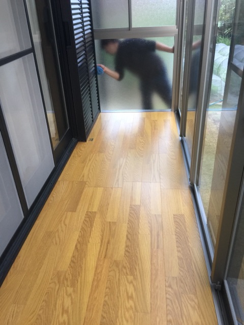 更にサンルームの『サニージュ』を施工。エアコンの配管がありますが、部材を一部カットしてクリアしております。現場加工もお任せください。芝も綺麗にカットして、柱をたて、セメント入れれば完成です。フローリング仕様!今回はミディアム系ですね。かなり木っぽいカラーで雰囲気もいいかんじ。